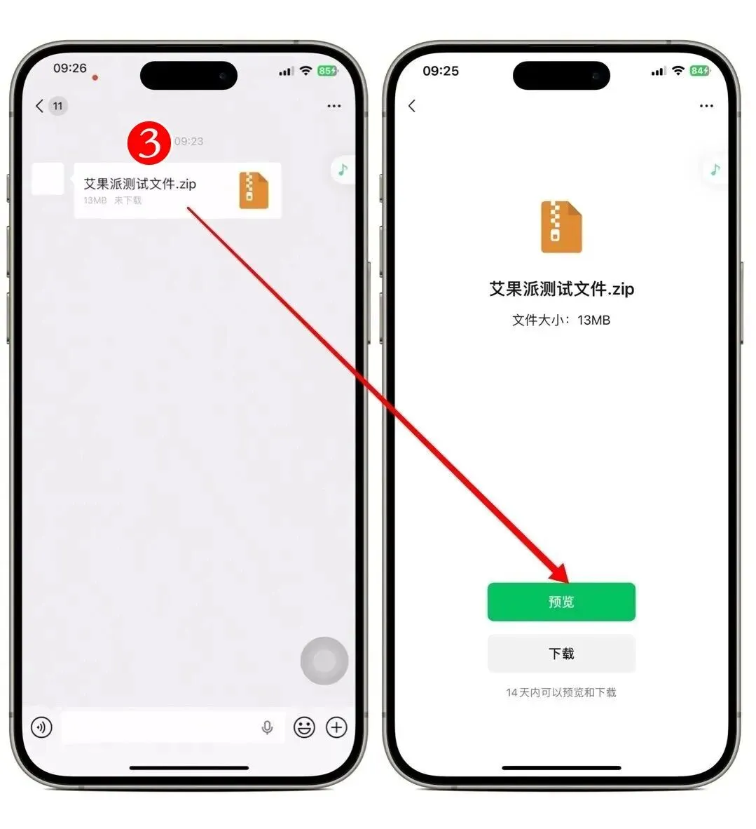 ❸ZIP预览:收到压缩包可直接在线打开查看文件列表,并能单独保存某个文件,节省手机存储。