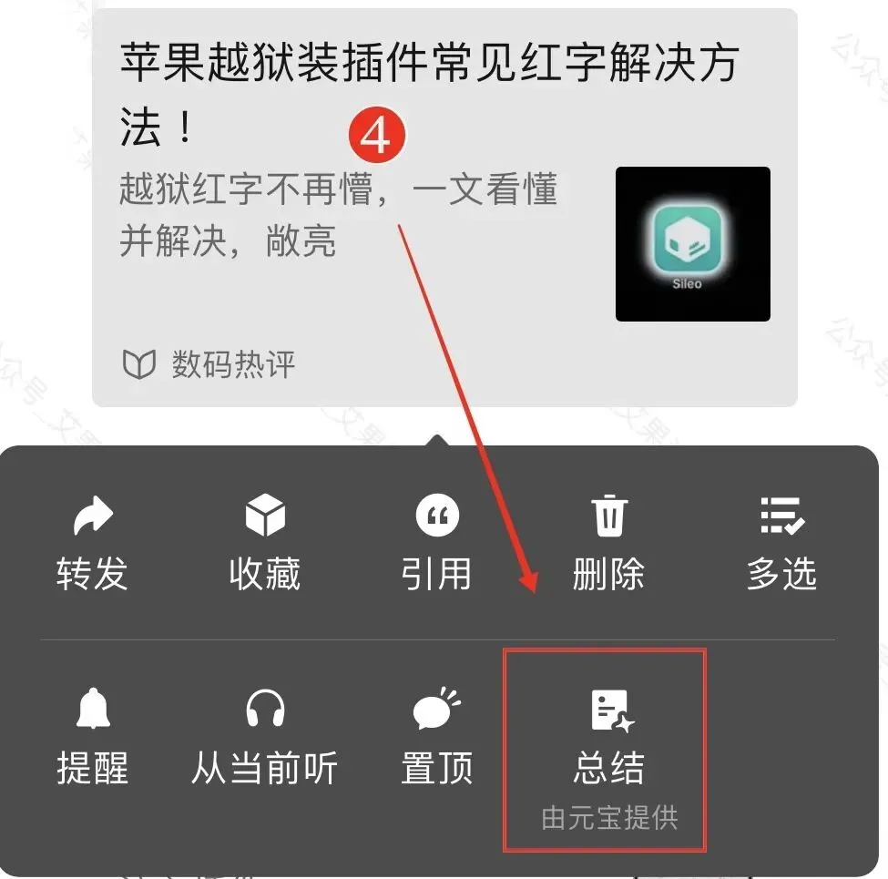 ❹AI文档总结:在聊天界面长按文件,新增“总结”选项,目前支持 PDF、Word、Excel等格式,转发的文章也可总结要点,但需配合腾讯元宝App使用。
