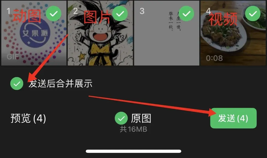 ❶多图合并发送:聊天页面点“➕” →“照片”从相册选择3张及以上图片/视频/动图,就会显示“发送后合并展示”选项。