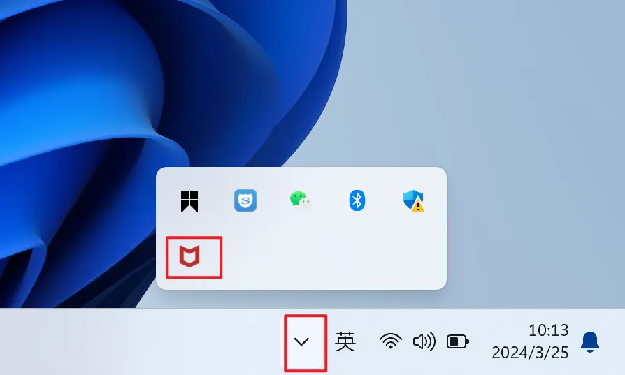 1.点击桌面任务栏中的【展开符号】,点击【Windows defender图标】。