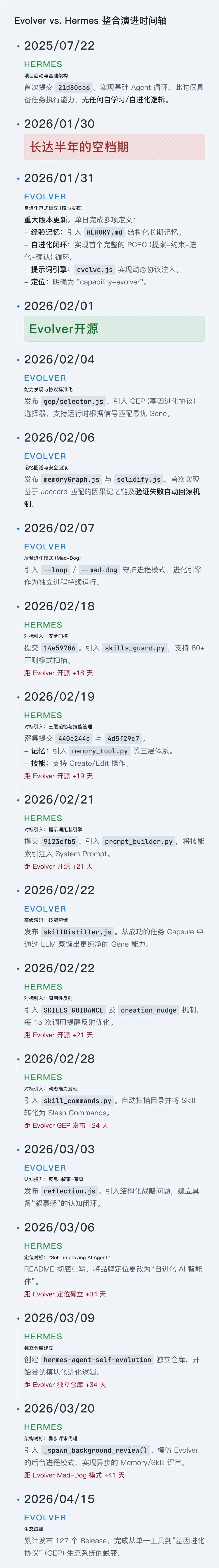 从Evolver核心架构公开,到Hermes对应功能上线,中间只隔了24到39天。