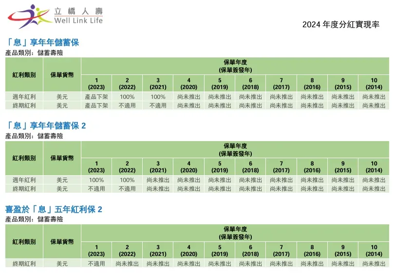 由2019年启动业务至2024年度之相应保单周年日,立Q所有分红保险计划的分红实现率均为100%。