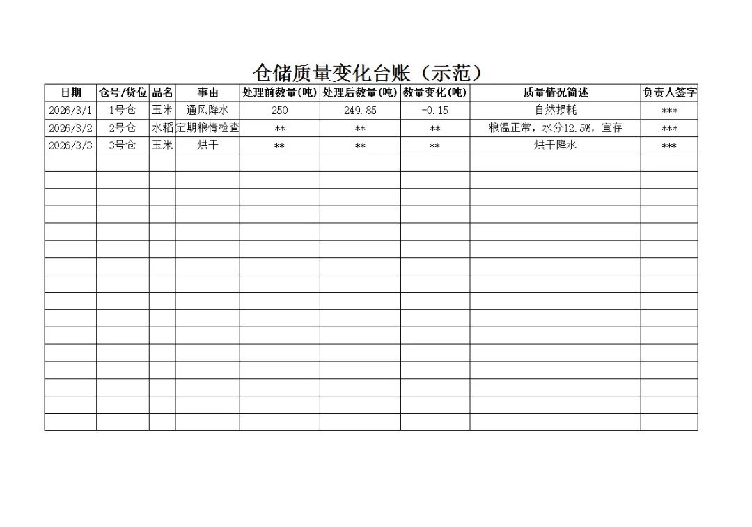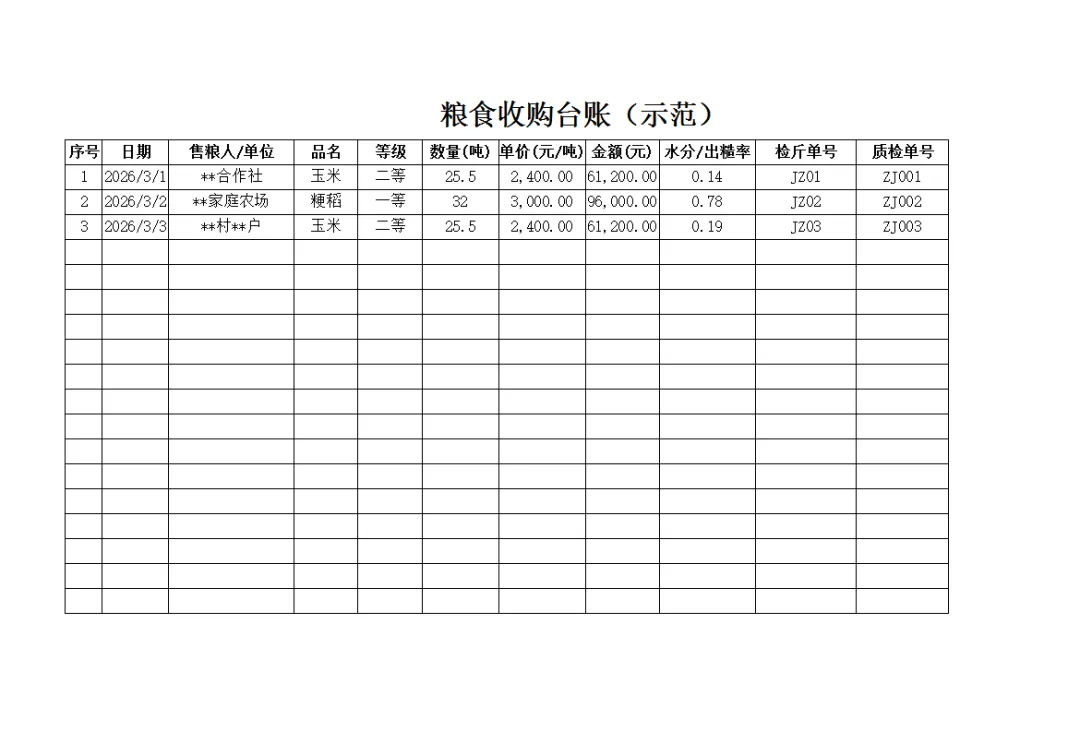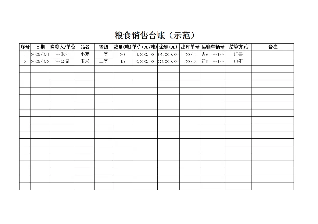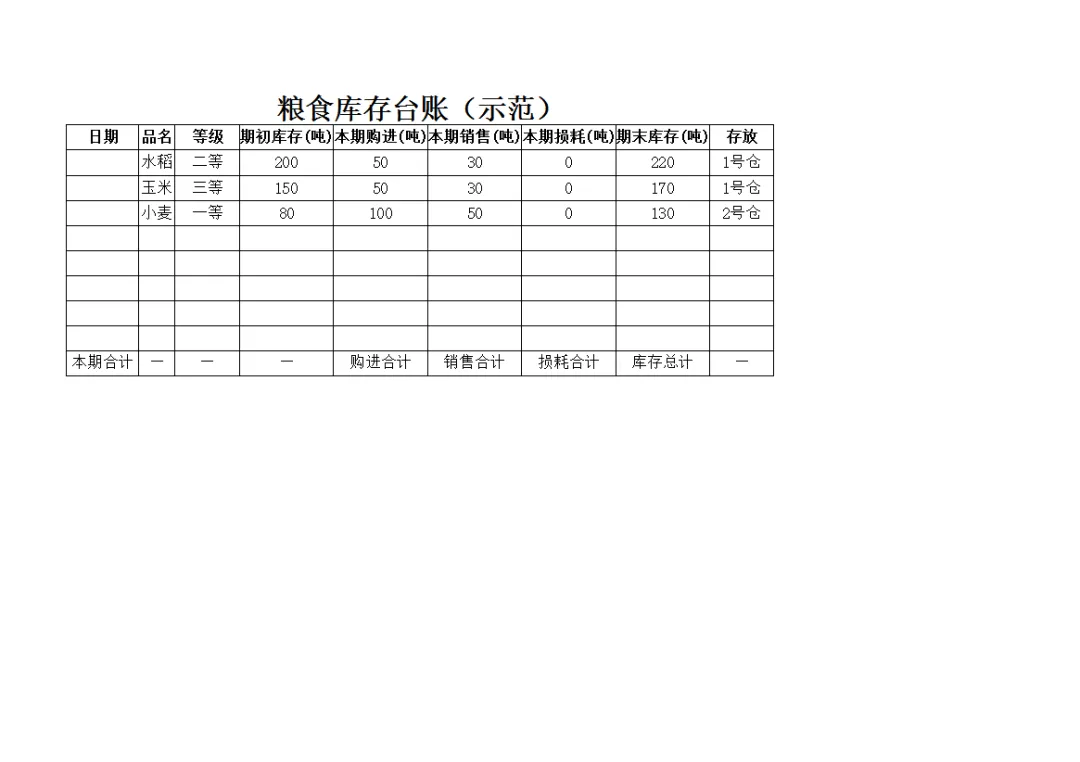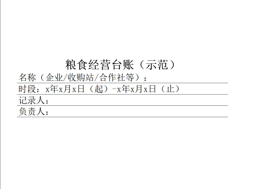 粮食经营台账简易模板账本封面,主要记录企业名称、记账时段、记录人、负责人等信息。账本第一页,主要记录记账期间库存信息。账本第二页,主要记录每笔购进粮食信息。账本第三页,主要记录每笔售出粮食信息。账本第四页,主要记录粮食质量和损耗等。以上模板仅供参考!!!
