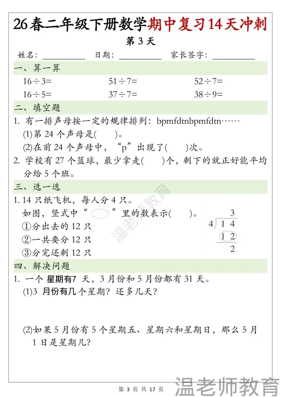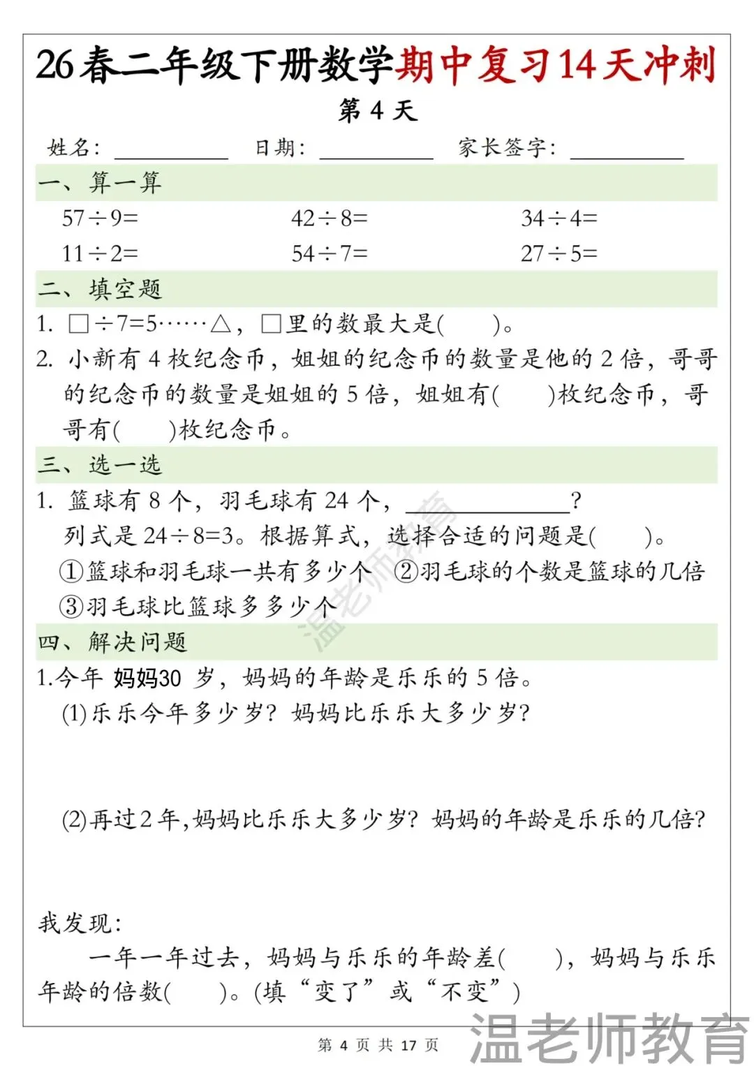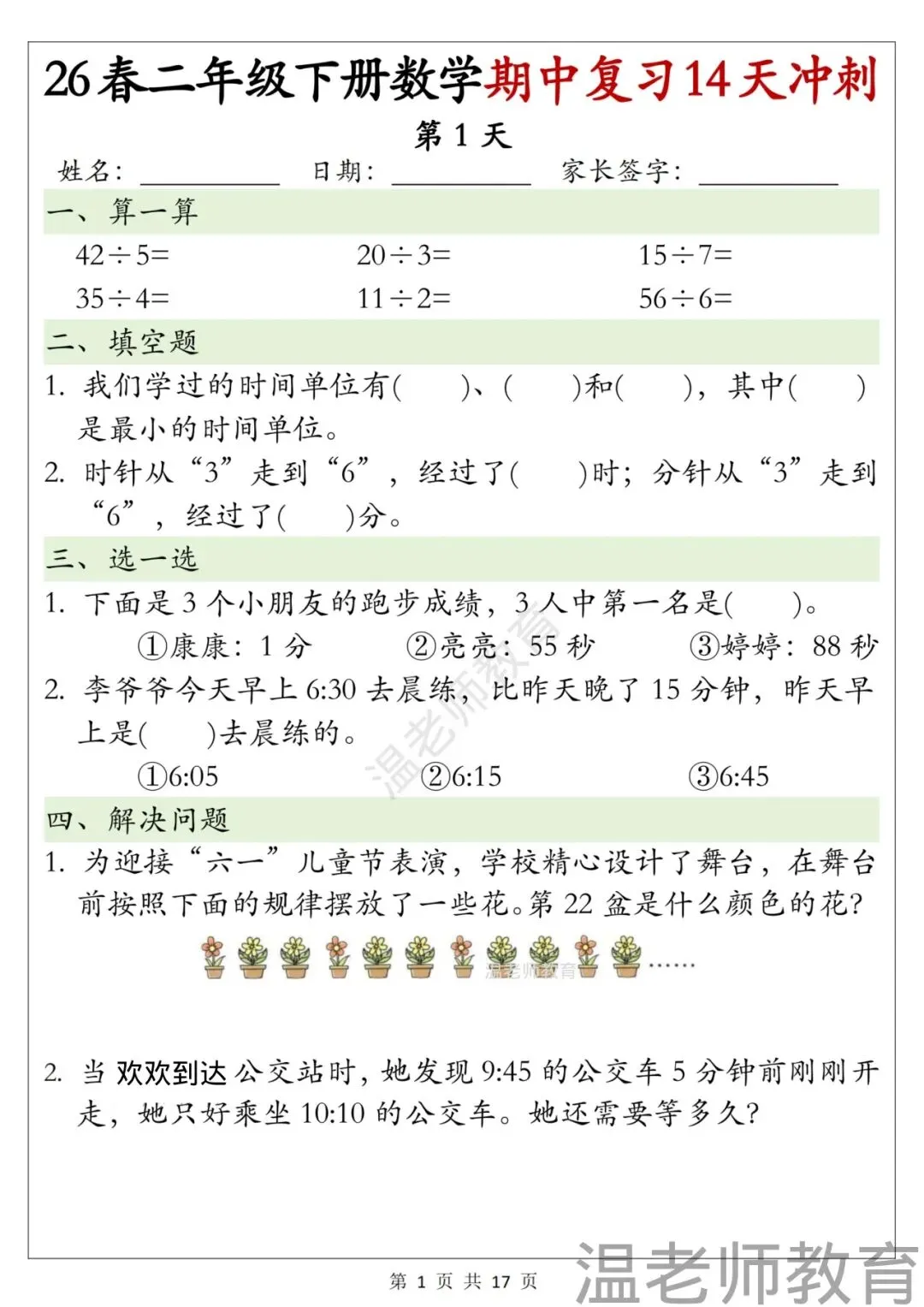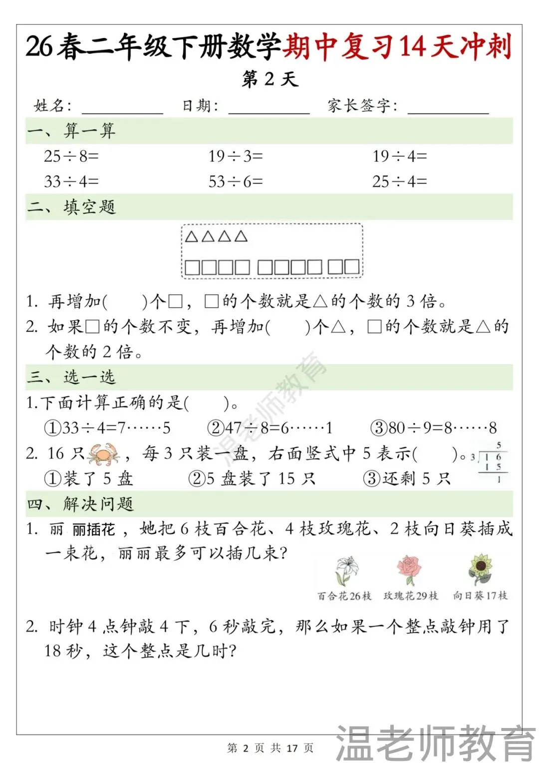 二年级下册数学期中复习14天冲刺