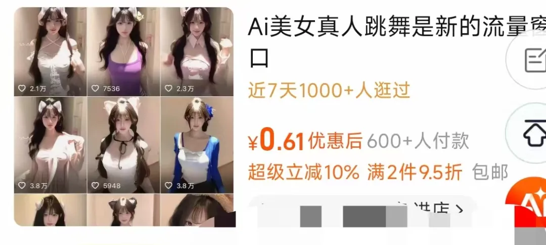 财经网科技从电商平台搜索可见,有店铺在售卖“ai美女真人跳舞是新的流量窗口”“2026女装ai提示词指令大全美女跳舞短视频图片模板生成”“性感美女ai绘图提示词”等商品。