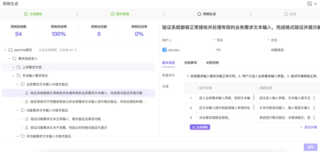 AIO平台提供可视化的用例生成流程(文档解析 → 需求梳理 → 用例生成 → 完成统计)和量化的质量指标(用例采纳率、用例召回率)。以某电商平台"用户积分兑换商品"功能为例,AI生成45条用例,采纳38条(采纳率84.4%),召回11个关键测试点(召回率91.7%),传统人工编写需2人/天,AI生成仅需5分钟,效率提升120倍。
