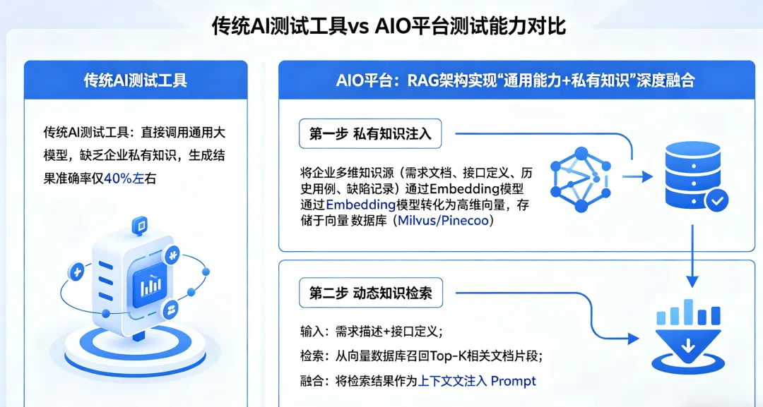 传统AI测试工具直接调用通用大模型,缺乏企业私有知识,生成结果准确率仅40%左右。AIO平台创新性地引入RAG(Retrieval-Augmented Generation)架构,实现"通用能力+私有知识"的深度融合: