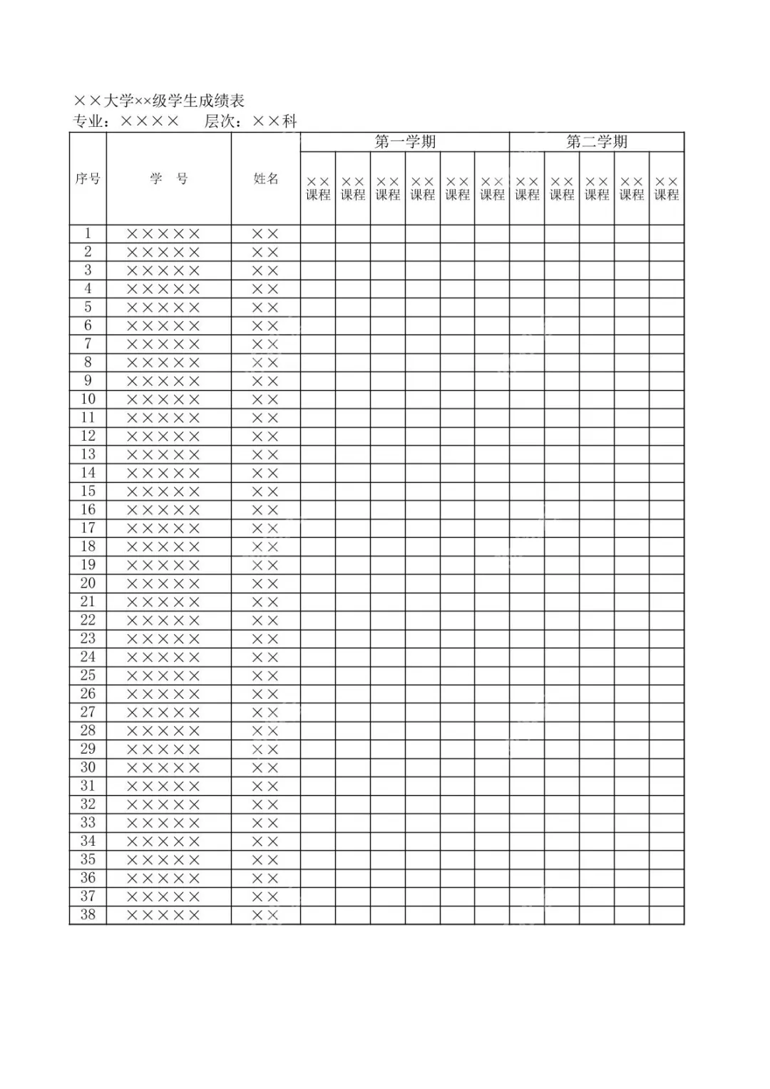 XX大学XX级XX专业XX科层次学生成绩统计表,是专为该年级教务管理、成绩整理打造的标准化工具,以黑白线条构建的规整表格为载体,风格简洁清晰,兼顾实用性与专业性,完美适配学校教务人员、辅导员及学生的成绩统计管理需求。表格顶部明确标注“××大学××级学生成绩表”,下方精准补充“专业:××××”“层次:××科”信息,确保文档归属清晰,避免跨年级、跨专业的使用混淆。主体结构上,表格设置了从1到38的连续序号栏,搭配以“×××××”“××”为占位符的学号、姓名栏,可直接对应该年级38名学生的身份信息,无需额外调整框架。成绩记录区域则按学期划分,第一学期与第二学期各设置7门课程栏,所有课程栏均以“××课程”占位,预留出充足的空白单元格,支持直接录入每门课程的具体成绩数据。无论是教务人员批量统计学生学期成绩、整理学业档案,还是辅导员追踪学生学业动态、分析班级成绩趋势,亦或是学生个人梳理在校学业成果、规划后续学习方向,这份预设框架的成绩统计表都能提供高效的标准化支撑。它省去了从零搭建表格的繁琐流程,规整的结构也便于后续进行数据筛选、排序与分析,助力相关人员轻松完成成绩统计与管理工作,提升教务管理效率与个人学业整理的便捷性。