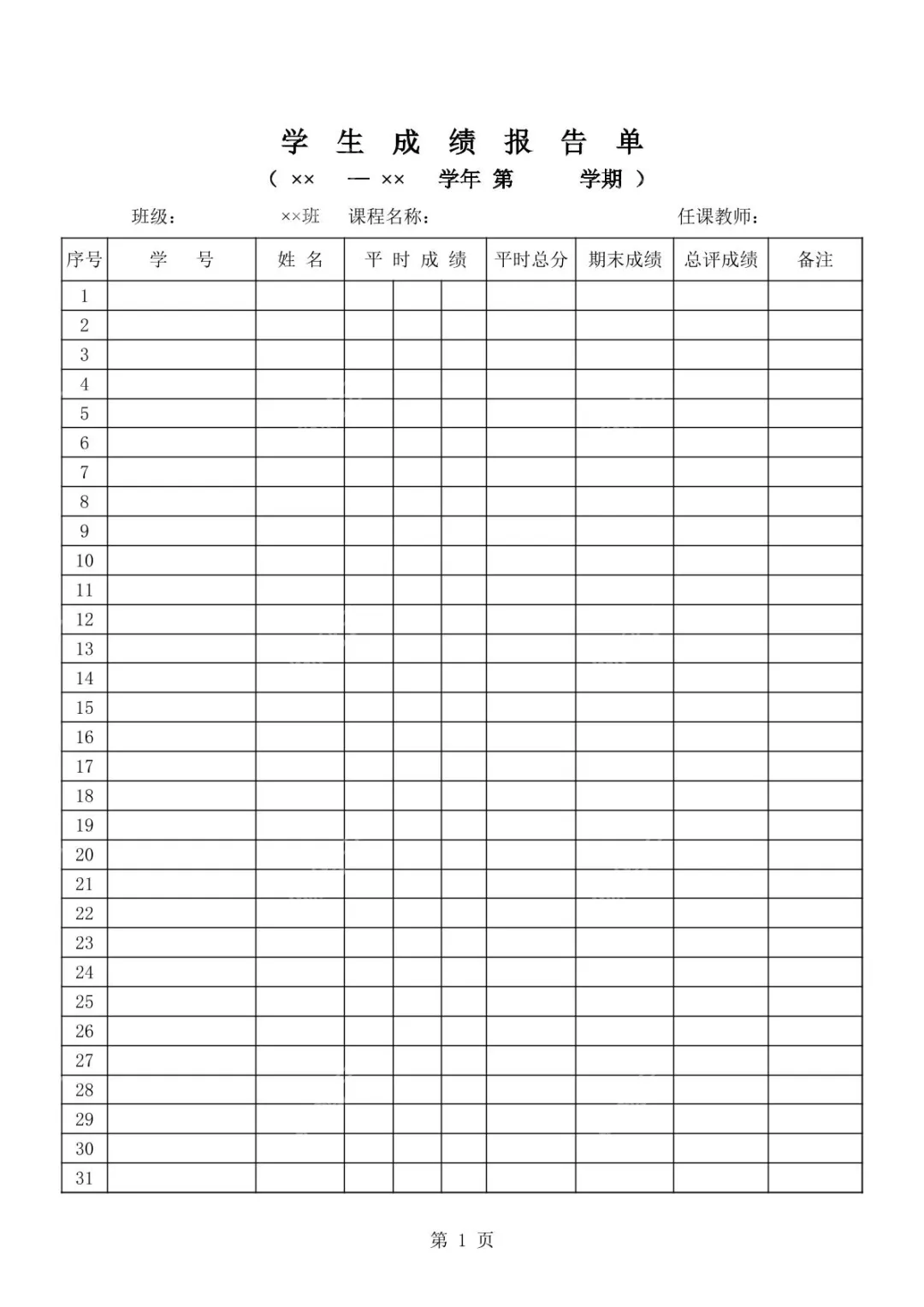 这款黑白简约风格的班级学生成绩报告单模板,是专为任课教师与教学管理人员打造的标准化成绩统计工具,完美契合教学管理规范,能大幅提升成绩汇总工作效率。模板以清晰规整的表格形式呈现,顶部醒目标注“学生成绩报告单”标题,下方预留“(××—××学年第 学期)”“班级:××班”“课程名称:”“任课教师:”填写栏,可精准匹配不同学期、不同班级的成绩统计需求。表格主体设置31行(序号1-31),能满足常规班级的学生人数覆盖,列标题包含序号、学号、姓名、平时成绩(含多列细分栏)、平时总分、期末成绩、总评成绩、备注,既可以细致记录学生日常作业、测验等零散成绩,又能通过“平时总分”一键整合日常表现,再结合期末成绩计算出总评成绩,让成绩构成一目了然,备注栏还可灵活标注学生的特殊情况,如缺考、加分项等。此外,模板底部标注“第1页”,支持多页衔接使用,适配人数较多的班级。整体线条简洁、预留填写空间充足,无需复杂调整即可直接上手使用,无论是学科任课教师日常统计成绩,还是教学管理人员整理归档,都能借助这款模板高效完成成绩统计、记录与汇总工作,让成绩管理更规范、更省心。