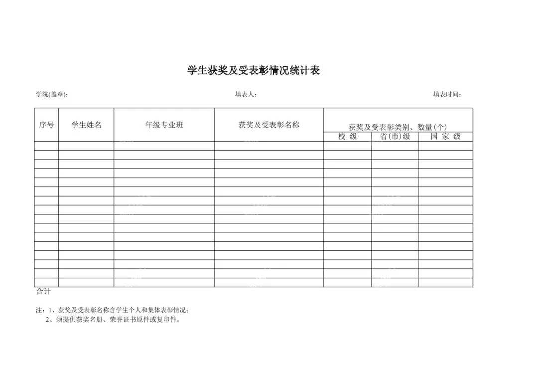专为院校行政人员、班级统计负责人打造的《学生获奖及受表彰情况统计表》,是一套专业、规范的学生荣誉信息统计模板,能大幅提升荣誉数据整理、汇总的效率与准确性。这份统计表采用简洁清晰的黑白配色设计,整体布局规整有序,视觉上一目了然。表格顶部居中位置标注醒目的“学生获奖及受表彰情况统计表”标题,左侧设置“学院(盖章)”栏,中间与右侧分别对应“填表人”“填表时间”栏,既符合行政文档的规范要求,也能明确统计工作的责任主体与时间节点。表格主体部分的列标题设置极具实用性,涵盖序号、学生姓名、年级专业班、获奖及受表彰名称等核心信息项,同时创新性地按校级、省(市)级、国家级划分获奖类别统计栏,以“数量/个”为统计单位,下方还设置了“合计”行,能直观呈现不同层级荣誉的分布情况,便于快速完成数据分类与汇总。表格底部的备注条款进一步保障了统计信息的真实性与可追溯性,明确要求获奖名称包含个人与集体表彰两类,且须同步提供获奖名册、证书原件或复印件作为佐证材料,彻底解决了荣誉信息“存疑难查”的行业痛点。无论是院校年度荣誉档案归档、评优评先数据支撑,还是班级学生成长轨迹梳理,这份标准化统计表格都能成为高效得力的工作助手,助力院校实现学生荣誉信息的规范化、精细化管理。