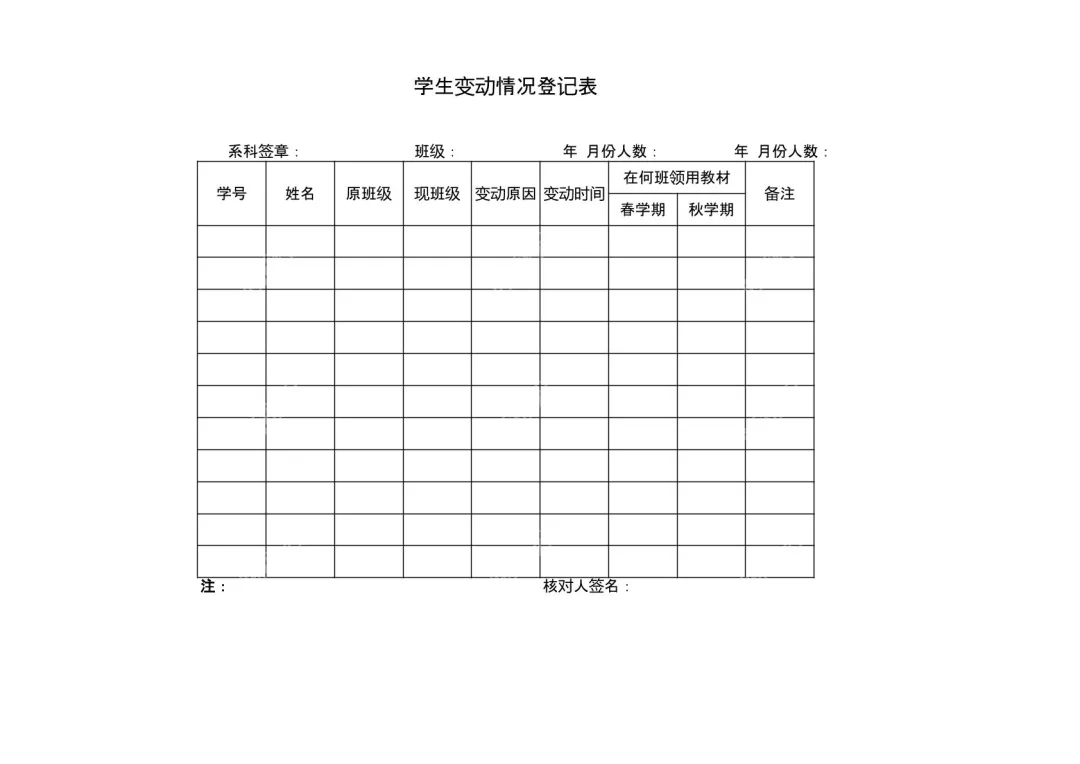 专为学校学籍管理打造的黑白配色版“学生变动情况登记表”模板,以简洁规整的布局设计,为行政人员、班主任提供专业高效的学生异动信息记录工具,助力优化校园学籍管理流程。模板顶部居中设置醒目的“学生变动情况登记表”标题,清晰点明表格用途;标题下方贴心设置“系科签章”“班级”“年 月份人数”双填写栏,便于提前明确登记范围与所属院系,为后续信息统计做好前置准备。表格主体区域以模块化列标题划分核心登记项,涵盖学号、姓名、原班级、现班级、变动原因、变动时间等学籍异动关键信息,确保学生班级调整的核心数据无遗漏;针对教材管理的痛点,特别设置“在何班领用教材”栏目,并细分为春学期、秋学期两个子项,同步记录学生异动前后的教材领用情况,避免出现教材错发、漏发或重复申领的问题;额外增设的“备注”栏,则可灵活补充特殊变动细节,满足个性化登记需求。表格底部左侧的“注:”标注区域,可补充登记规则、特殊说明等内容;右侧的“核对人签名”栏,则为信息准确性提供双重保障,实现学籍变动信息的可追溯、可核查。无论是应对学生转班、插班、休学复学等常规异动,还是处理特殊学籍调整场景,这份标准化的表格模板都能帮助学校工作人员规范完成信息登记,大幅提升学籍管理的效率与专业性。