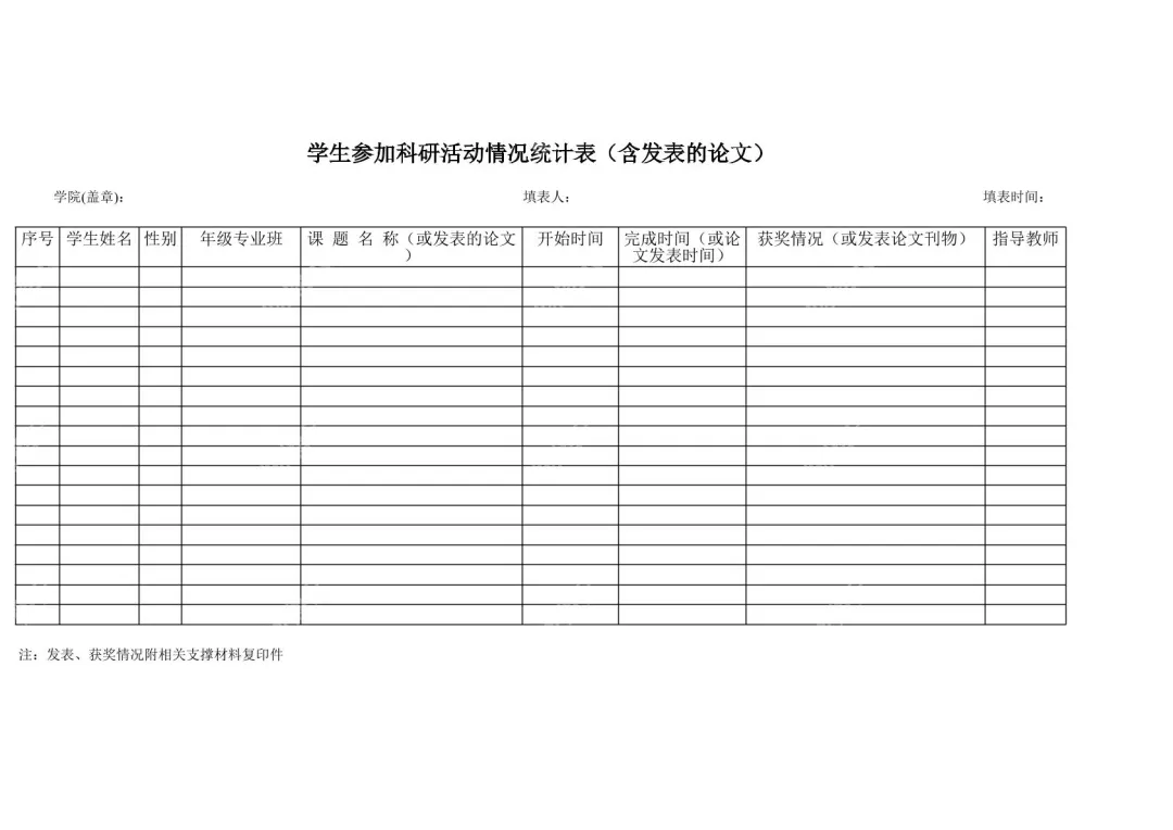这张“学生参加科研活动情况统计表(含发表的论文)”是专为高校学院打造的标准化学生科研成果统计工具,以白底黑字的简洁正式风格,为高校行政人员、教学管理者提供高效统一的学生科研数据收集解决方案。表格顶部布局清晰规整,居中位置标注醒目标题,左侧设置“学院(盖章):”栏位用于官方确认,中间预留“填表人:”填写区域明确责任主体,右侧“填表时间:”栏则便于统计工作的时间追溯,从源头保障统计数据的规范性与权威性。表格主体采用黑色线条划分单元格,列标题涵盖序号、学生姓名、性别、年级专业班、课题名称(或发表的论文)、开始时间、完成时间(或论文发表时间)、获奖情况(或发表论文刊物)、指导教师等核心统计项,多行列的空白填写区域,既能满足单个班级的小规模统计需求,也能适配全院级别的批量数据汇总。针对科研成果的真实性验证需求,表格底部左侧特别标注“注:发表、获奖情况附相关支撑材料复印件”,为后续成果审核、数据存档提供明确指引。无论是日常的学生科研活动追踪、学期末的科研成果汇总,还是评优评先时的科研数据核查,这份结构化统计表格都能帮助高校学院简化统计流程、统一数据标准,有效提升学生科研管理工作的效率与专业性,是高校科研管理工作中不可或缺的实用工具。