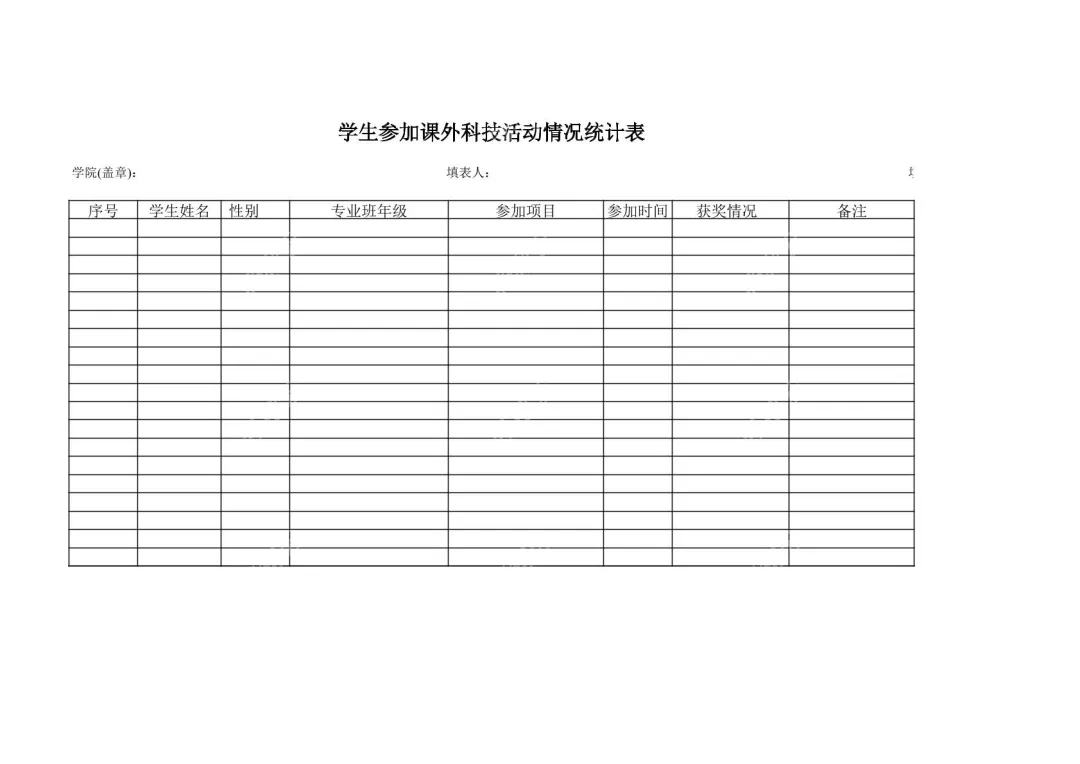 专为院校行政人员、班级统计负责人打造的《学生参加课外科技活动情况统计表》,是规范学生课外科技活动数据管理的高效工具。表格采用白底黑字的简洁正式设计,整体布局清晰规整,完全契合院校统计工作的标准化需求,让数据记录、整理更省心。表格上方居中位置设置黑色加粗的“学生参加课外科技活动情况统计表”标题,醒目清晰,一眼就能明确表格用途。标题下方的填报规范栏,左侧预留“学院(盖章):”位置,中间设置“填表人:”填写栏,从源头保障统计数据的权威性与可追溯性,符合院校行政工作的严谨要求。表格主体部分的核心统计项覆盖全面,列标题从左到右依次为序号、学生姓名、性别、专业班年级、参加项目、参加时间、获奖情况、备注,每列下方均设置充足空白行,可批量记录多名学生的活动信息。无论是记录学生参与机器人竞赛、科技创新大赛、科研实践项目等各类课外科技活动,还是标注活动开展的具体时间、获奖等级,或是补充活动中的特殊细节,都能找到对应填写区域,完整还原学生课外科技活动的参与轨迹。这份标准化统计模板,既能帮助院校系统掌握学生课外科技活动的整体参与情况,为后续科创活动策划、资源分配提供数据支撑,也能让班级统计工作更高效有序,避免信息遗漏或统计混乱,是院校科创管理工作中不可或缺的实用工具。