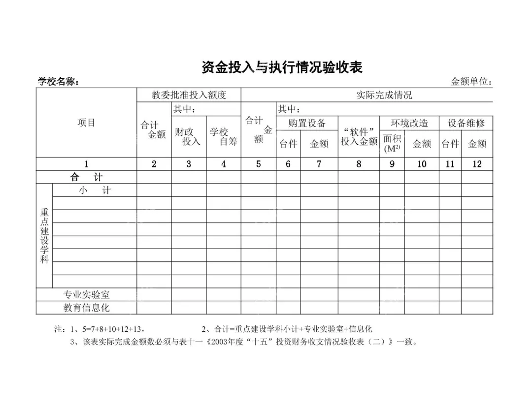 这张黑白印刷的“资金投入与执行情况验收表”,是专为学校项目资金管理打造的标准化验收统计工具,能帮助学校财务人员、项目负责人高效完成项目资金的核对、统计与验收工作,确保资金使用合规、数据准确可追溯。表格整体布局清晰规整,顶部醒目标注“资金投入与执行情况验收表”标题,下方左侧设置“学校名称:”“金额单位:”填写项,方便使用者快速完成基础信息录入。核心区域划分为“教委批准投入额度”和“实际完成情况”两大板块,前者涵盖“合计金额”“财政投入”“学校自筹”三类核心资金来源统计,清晰呈现项目的资金获批底数;后者则进一步细化为“购置设备”(含台件、金额双维度统计)、“‘软件’投入金额”、“环境改造”(含面积、金额统计)、“设备维修”(含台件、金额统计)等明细项,所有项目均标注1-12的序号,便于数据关联与交叉核对。为适配不同类型的学校项目,表格下方还设置了“重点建设学科”(含小计行)、“专业实验室”“教育信息化”等专项项目行,满足各类教学、基建、信息化项目的资金验收需求。表格底部的“注”更是明确了详细的计算逻辑,比如“5 = 7 + 8 + 10 + 12 + 13”等公式,清晰界定了各项数据的勾稽关系,同时标注了数据匹配要求,从规则层面保障统计工作的规范性与准确性,是学校项目资金验收工作中实用性极强的专业模板。