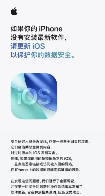 iOS 17.5 及以上:已修复所有已知网页攻击漏洞 iOS 16.7.15 / iOS 18.7.7:老设备专属安全补丁 iOS 15 及更早:苹果已提供安全更新