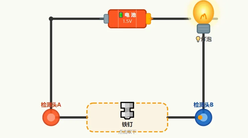基本设计是一个完整的电路检测器。电池、导线、灯泡还有两个检测头都画在屏幕上。学生从侧边栏把物体拖到两个检测头中间,电路就会自动判断这个物体让不让电流通过。灯泡亮了就是导体,不亮就是绝缘体。操作特别简单,鼠标点住一拖一放就行,平板电脑上用手指也能直接拖,学生上手很快。