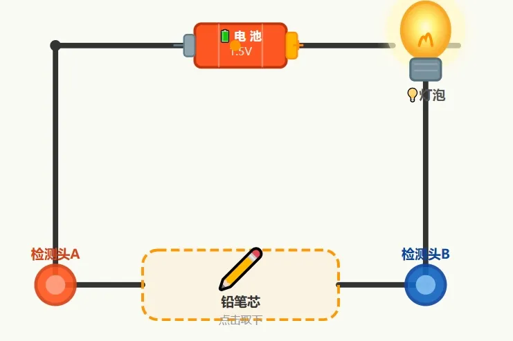 学生拖拽几次就会发现,金属类的基本都让灯泡亮起来,塑料橡皮这类就不行。有一个东西比较特别,就是铅笔芯。它不是金属但也能让灯泡发光,这个发现往往会让学生挺意外的。我会趁机讲一讲石墨也能导电,导体不只有金属。