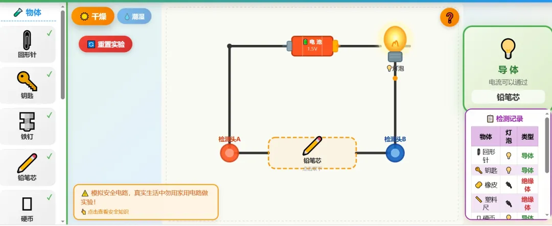 第一轮让学生自由拖拽,随便测哪啥都行,目标是熟悉操作和观察灯泡变化,大概五分钟就够了。第2轮我让他们先猜后测,比如猜一猜铅笔芯能不能让灯泡亮起来,猜一猜硬币和回形针结果是不是一样,再去拖拽验证。第三轮切换到潮湿模式,专门测木头、纸巾、纸张在干燥和潮湿两种状态下的不同表现,这个对比效果很明显。