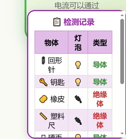 课件右侧有两个结果展示卡片。检测完成的时候,对应的导体或绝缘体卡片会高亮显示,被检测物体的名字也会出现在卡片上。底下还有一个记录表格,每一次实验的结果都自动保存下来,谁测了什么、灯泡亮没亮、是导体还是绝缘体,一目了然。课堂小结的时候直接看这个表格,学生自己就能总结出导体和绝缘体的规律。