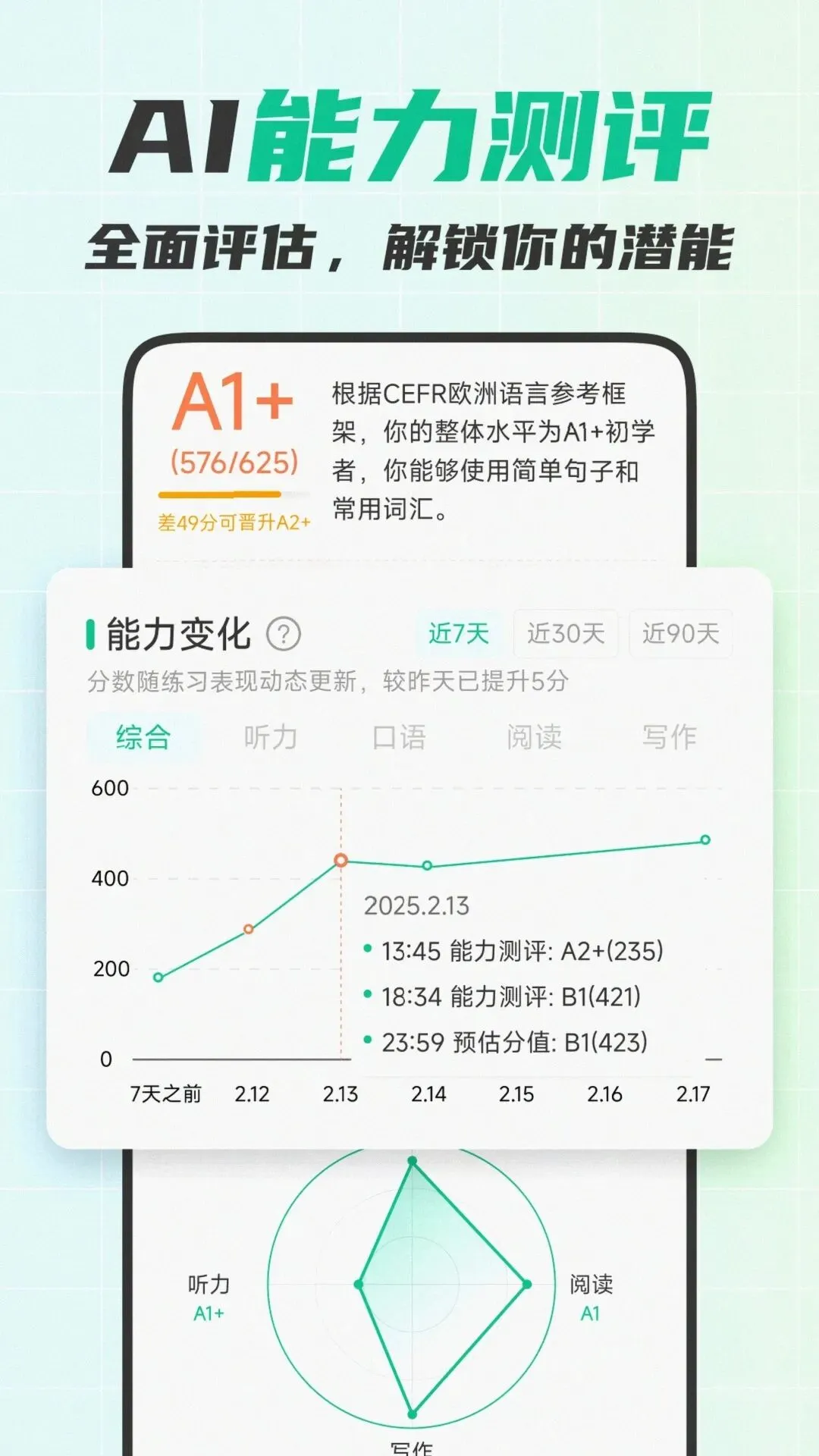 AI智能测评+精准纠错,进步看得见:基于CEFR国际标准打造的测评系统,从A0入门到C2母语级全覆盖,精准定位孩子的英语水平,自动生成专属学习路径。AI还能从音素级纠正发音,不管是元音咬不准还是辅音发不清,都能实时指出并示范标准发音,搭配即时鼓励式评分,孩子每一次开口都有正向反馈,自信越练越强。