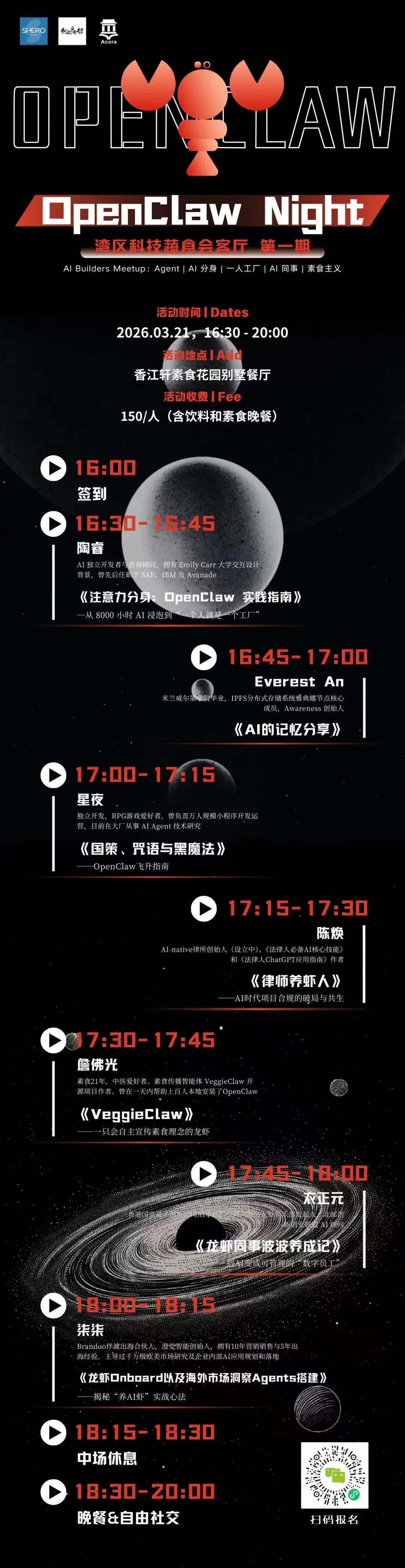 2026年3月21日,香江轩,20余位AI创业者、开发者、跨界探索者齐聚一堂,用7场高密度分享,拆解了从出海营销到法律合规、从个人效率到素食传播的AI实践全景图