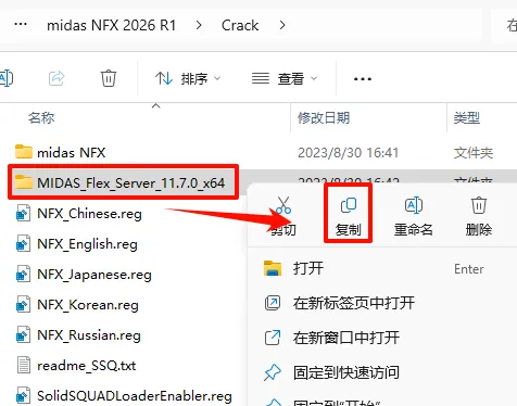 2.打开刚刚解压的文件夹,双击打开“Crack”文件夹,选中 ”MIDAS_Flex_Server_11.7.0_x64“文件夹,鼠标右键点击“复制”