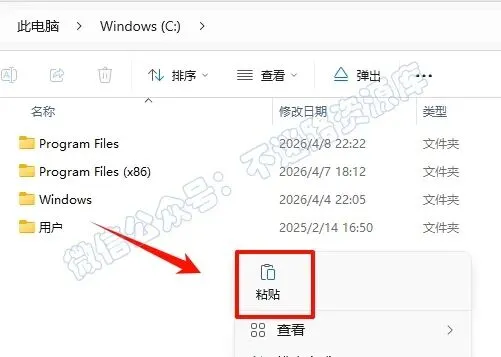 3.打开桌面“此电脑”,打开C盘根目录,鼠标右键“粘贴”复制的文件夹(若提示需要权限,勾选“为所有当前项目执行此操作“,点击“继续“)