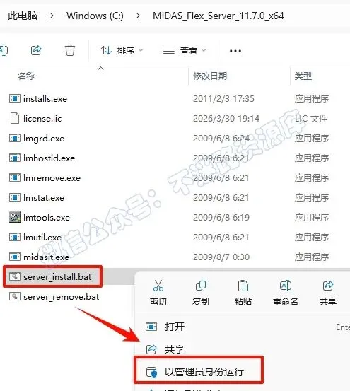 4.完成粘贴操作之后,双击打开复制过来的“MIDAS_Flex_Server_11.7.0_x64”文件夹,鼠标右键点击“server_install.bat”选择“以管理员身份运行”(运行前请关闭电脑中的杀毒软件)