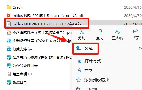 6.返回之前解压的“midas NFX 2025 R2”文件夹,鼠标右键点击“midas.NFX.2026.R1_2026.03.12.Win64.iso”文件,选择“装载”(如果没有“装载”选项的可以右键选择“打开方式—Windows资源管理器”打开)