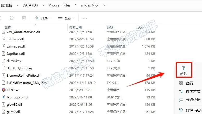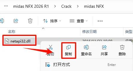 17.返回之前解压的“midas NFX 2026 R1”文件夹,依次打开“Crack——midas NFX”文件夹,选中 ”netapi32.dll“文件夹,鼠标右键点击“复制”
