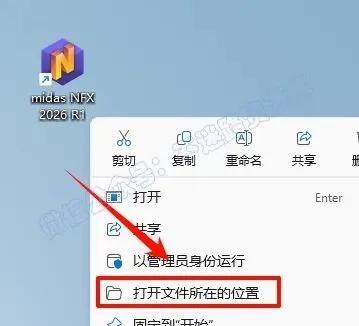 18.选中”midas NFX 2026“软件图标,鼠标右键点击“打开文件所在位置”