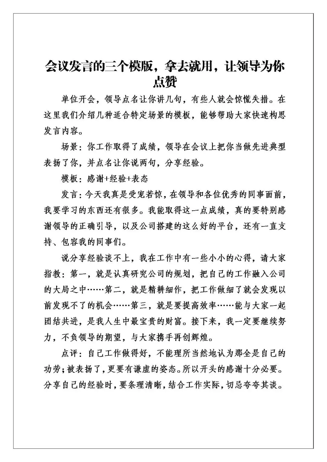 《会议发言的三个模版,拿去用,让领导为你点赞》——这稿子厉害在把“临场慌”变成“有套路可抄”,三个场景对应三套话术,像工具箱一样拎出来能用;
