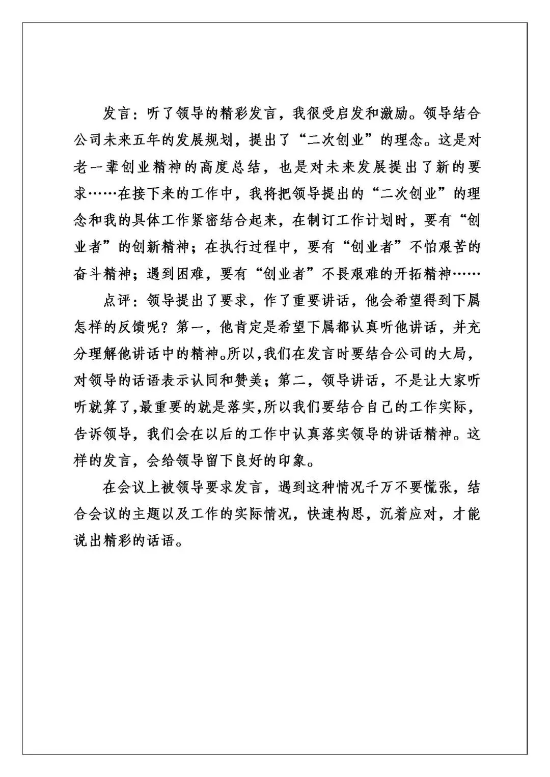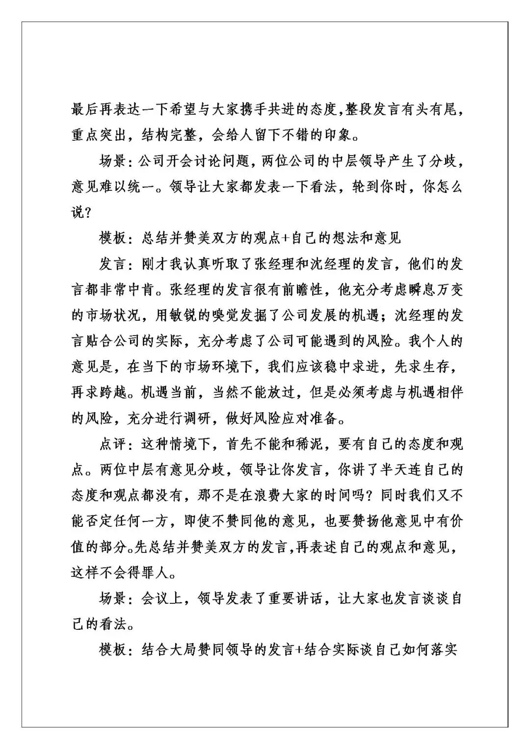 写作角度非常实在,不讲虚的“口才艺术”,专攻“被点名时怎么不掉链子”,像文章中这样的比喻分歧场合夸张经理、沈经理,亮自己观点,保场面不失立场;