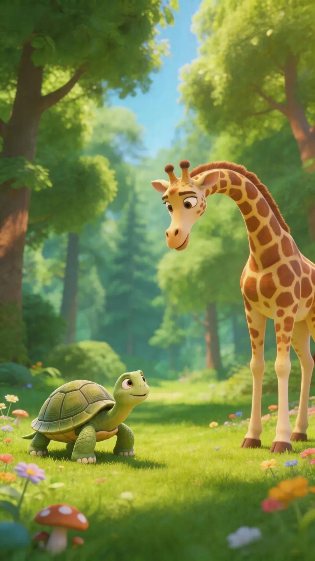 旁白:在一片美丽的森林里,住着一只行动慢吞吞的小乌龟和一只高大的长颈鹿。