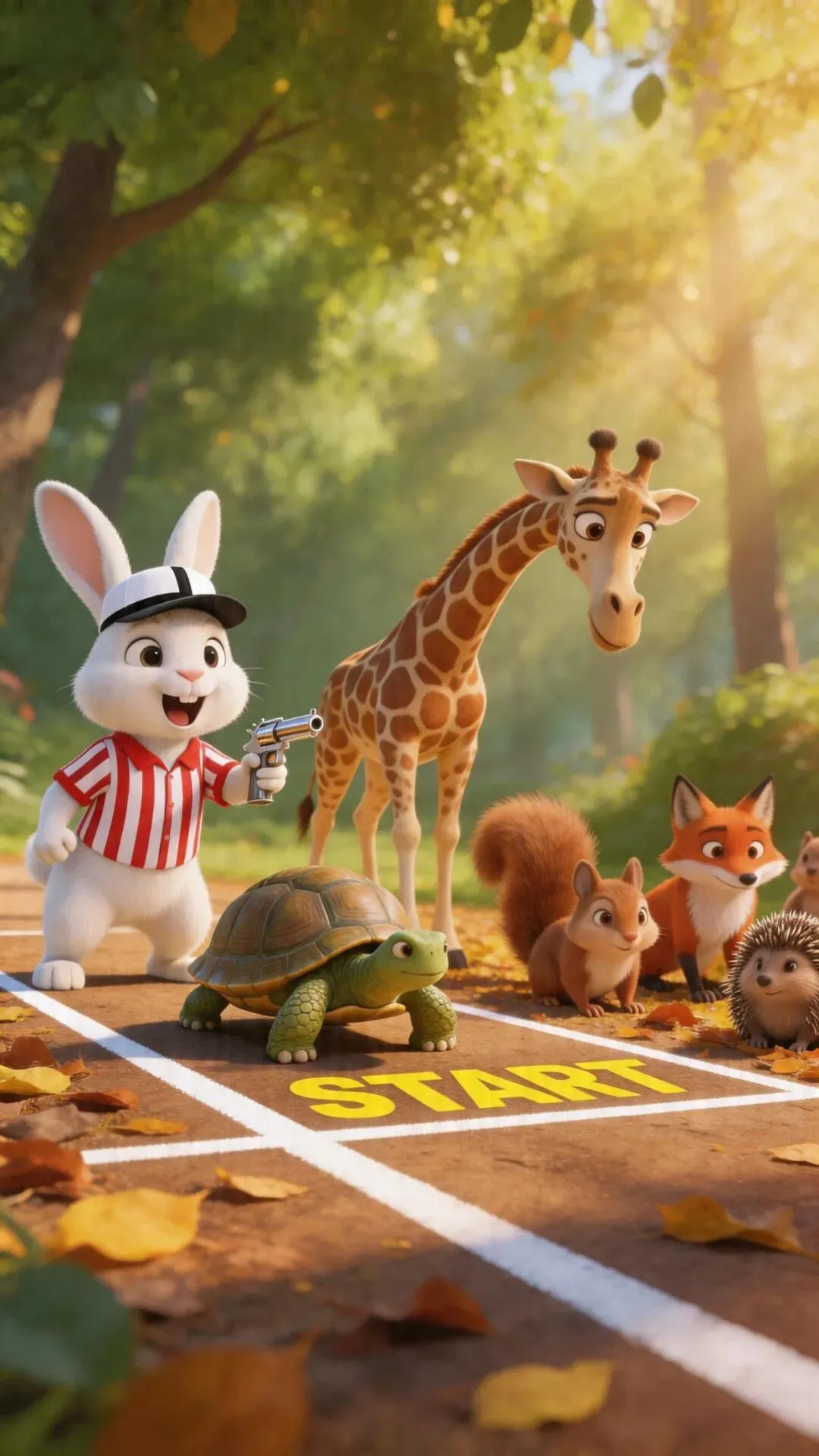 3D皮克斯风格,森林运动会现场,小乌龟、长颈鹿和其他小动物们准备起跑