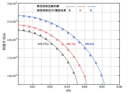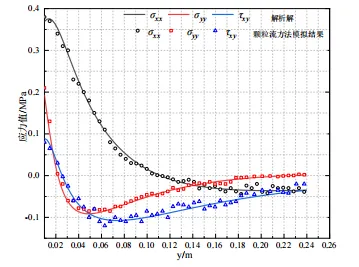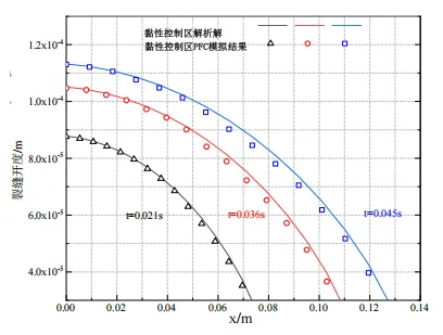 渗流力验证:模拟饱和土体稳态渗流,计算颗粒所受渗流力总和,结果与土力学经典公式计算结果吻合,证明了改进算法可精准捕捉渗流力。应力场验证:在均匀地应力下加载模型,测量模型内部应力分布,结果与经典弹性力学解析解高度一致,验证了模型在加载下的力学响应准确性。裂缝扩展验证:模拟简单条件下的水力裂缝扩展,其几何形态(裂缝宽度、长度随时间变化)与经典的KGD(Khristianovic-Geertsma-de Klerk)解析解模型对比良好,证明了模型模拟裂缝动态扩展的能力。