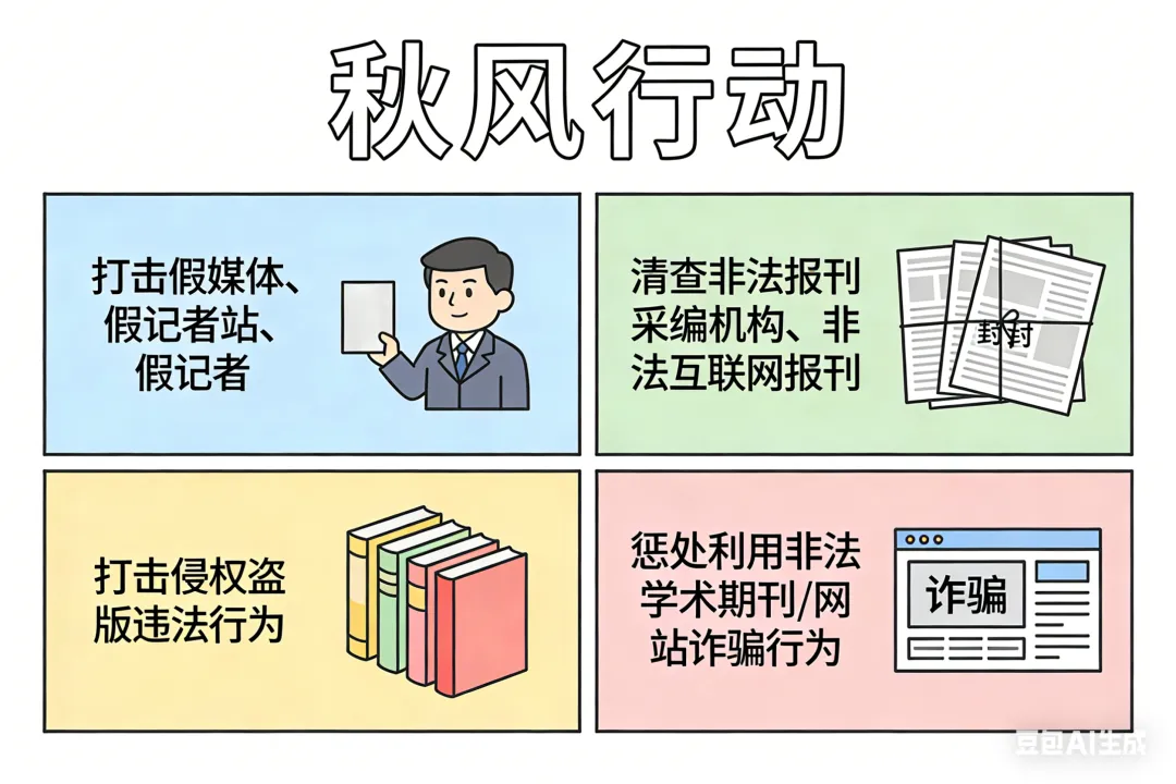 秋风行动:打击假媒体、假记者站和假记者。清查各类非法报刊采编机构和非法互联网报刊。打击侵权盗版违法行为。严厉惩处利用非法学术性期刊或网站实施诈骗活动的行为。
