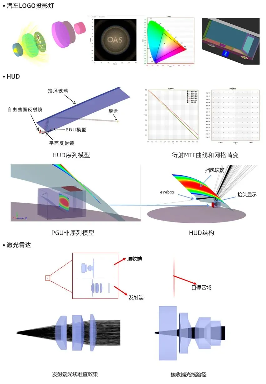 软件为照明和车灯设计提供了强大的虚拟仿真与优化功能,能够进行精准的光学性能与效果分析,完成自动化参数优化与方案验证。其核心功能完整覆盖了车灯设计、激光雷达光学系统、抬头显示器(HUD)以及内饰氛围照明等关键环节,实现了从光源、光路到分析的全链路仿真,从而系统地满足汽车行业在智能化与个性化趋势下的光学创新需求。