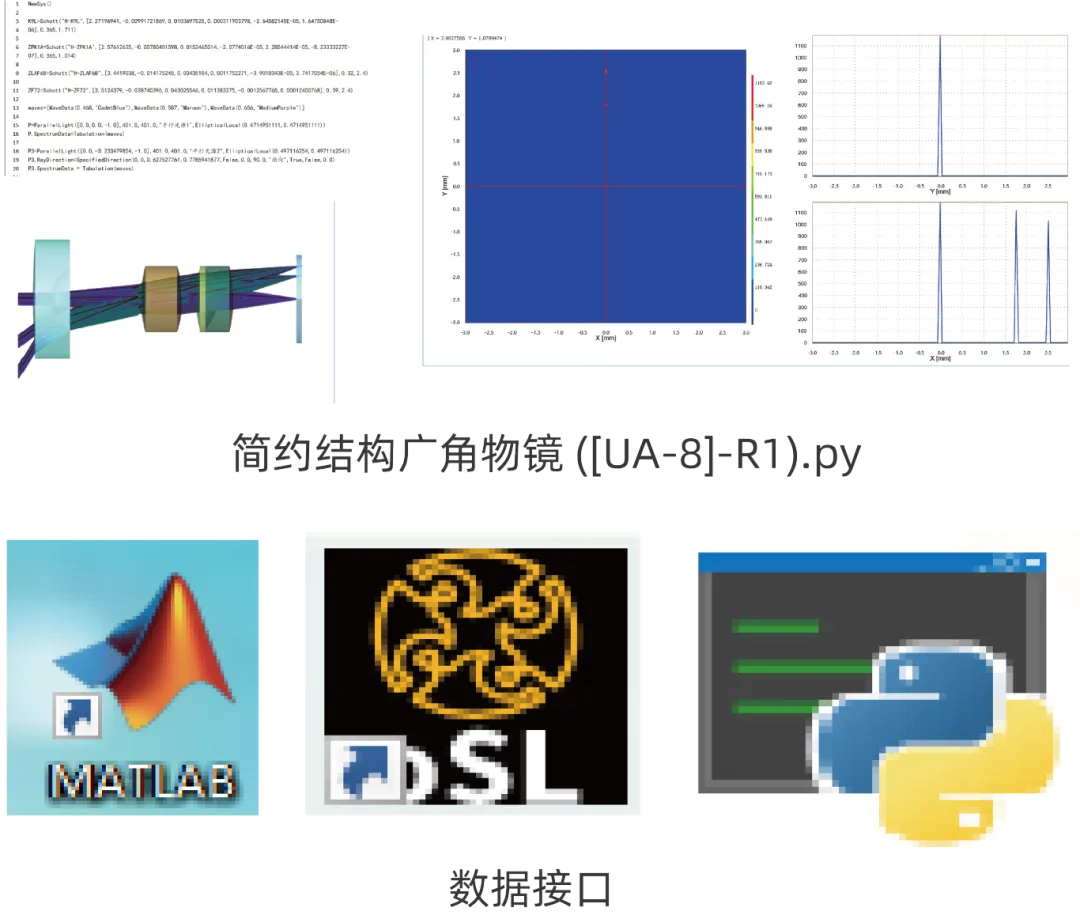 软件支持数据接口功能,语法设计简洁易懂,便于读写,拥有丰富的标准库,涵盖了OAS软件全部功能,包括全局设置,模型建立,光线追迹、分析和优化以及按照需求创建新的材料、膜层、光谱等等功能。模块能够简便高效建立所需的多个模型,能够自动化地由代码转化成案例,且直接调用与其它软件的算法,联合计算。