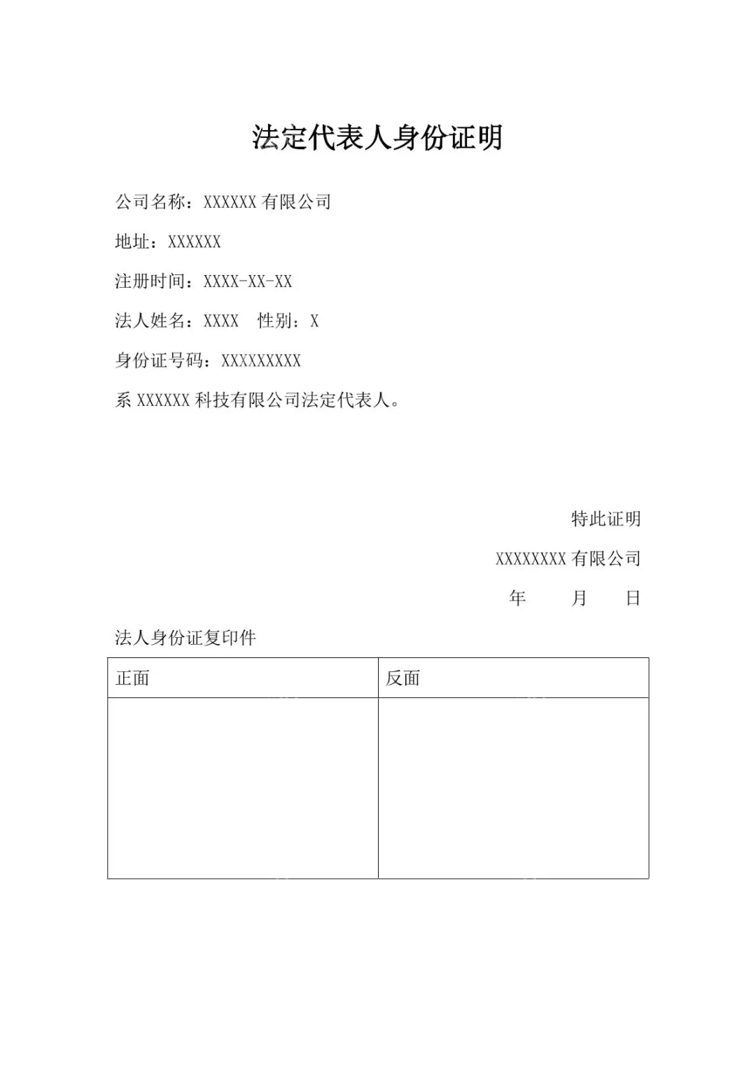 这份文件是一份正式的法人身份证明,用以确认“XXXXXX有限公司”的法定代表人身份。文档明确列出了公司的全称、注册地址(地址信息在文中留空)以及确切的注册时间(XXXX-XX-XX)。证明的核心是法定代表人“XXXX”的个人信息,包括其性别、身份证号码,并声明其系本公司的法定代表人,具有法律效力。文档尾部以“特此证明”的规范格式,并加盖了出具方“XXXXXXXX有限公司”的公章(文档以“盖章”字样体现)和日期。此外,文件还附有预留的法人身份证正反面复印件位置,以进一步核实身份信息的真实性。此份材料是公司在办理银行开户、签署重大合同、参与项目投标或进行其他需要法定代表人身份背书的商务与法律活动时,必备的基础性法律文件之一,旨在向第三方机构权威证明公司法人代表的合法资格与身份。