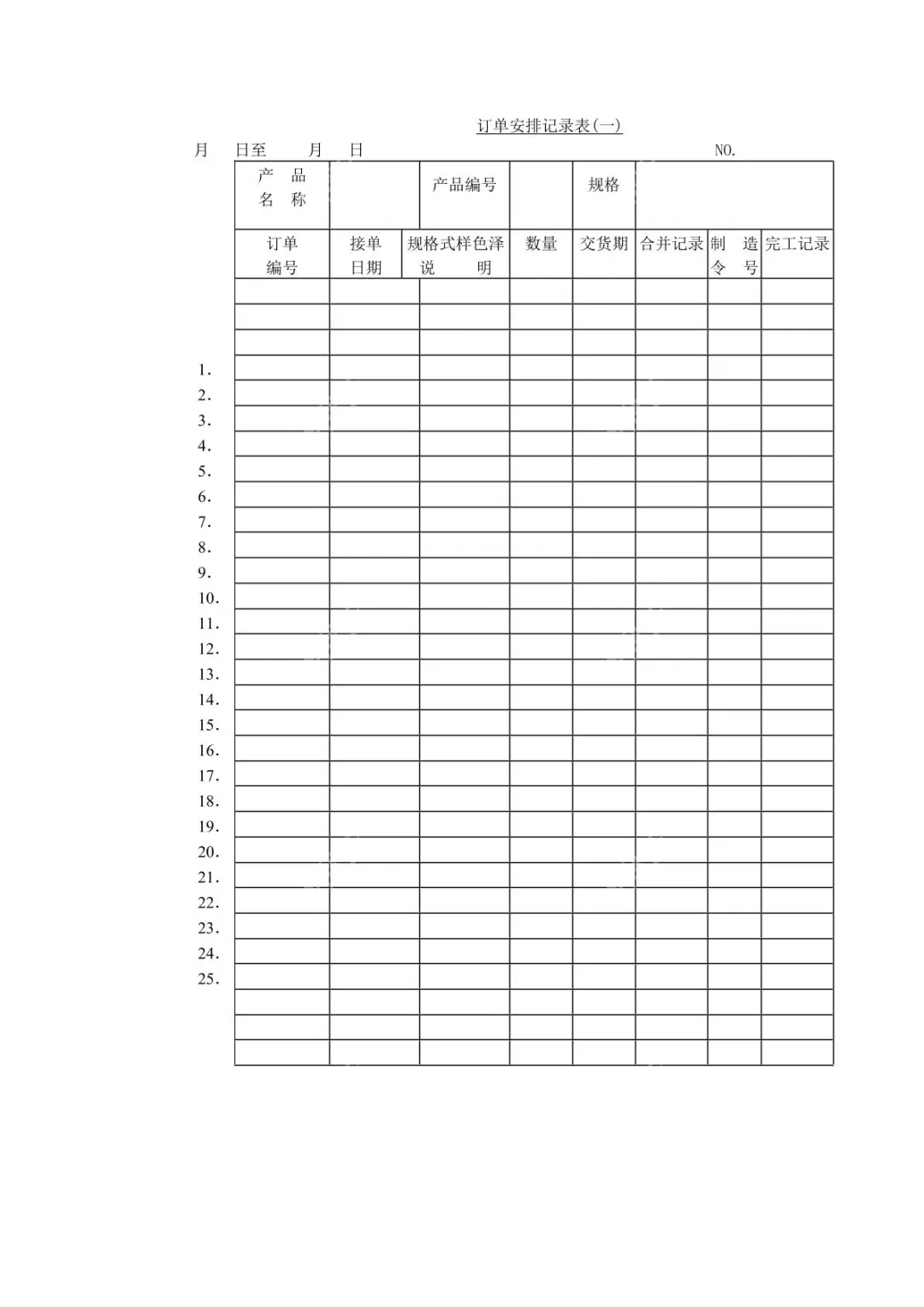 对于生产制造企业、贸易加工厂以及接定制订单的中小商家来说,混乱的订单记录往往会导致交货延期、生产进度错漏、产品信息核对失误等诸多问题,不仅影响客户满意度,还会增加企业的沟通和管理成本。这款专业的订单安排记录表模板,正是为解决企业订单管理混乱问题打造的高效办公工具,能够帮助企业全方位规范订单信息记录,清晰梳理生产进度,从源头提升订单管理效率。这款名为“订单安排记录表(一)”的企业办公表格模板,在设计上充分贴合生产型企业的订单管理需求,表格顶部专门预留了统计日期区间和整体订单编号的填写位置,方便管理人员快速按时间或订单批次检索整理信息,满足月度、季度订单统计梳理的需求。模板的主表格设置了全覆盖的多列核心字段,涵盖产品名称、产品编号、规格、订单编号、接单日期、规格式样色泽说明、数量、交货期、合并记录、制造令号、完工记录等全流程信息维度,无论是标准化量产产品,还是需要标注特殊要求的定制订单,都能完整记录所有关键信息,避免信息遗漏。同时,模板还预设了1到25共25行的填写行,足够满足中小企业常规批次的订单记录需求,拿到即可直接使用,不需要额外调整格式。通过使用这款订单安排记录表模板,企业可以清晰记录每一笔订单的产品信息、订单编号、接单日期、需求数量、约定交货期等核心内容,让跟单人员、生产部门都能快速获取准确订单信息,有效助力企业规范订单管理与生产进度管控,降低沟通成本,避免交期失误,提升整体运营效率。不管是小型加工厂还是贸易型企业,都可以直接套用这款订单安排记录表模板,快速搭建标准化的订单管理体系。