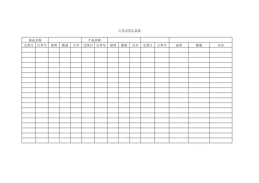 这是一份专业实用的订单合并汇总表模板,专为需要整合多渠道零散订单、统筹供应链管理的商家、采购人员以及行政运营人员打造,能够清晰整理不同订单的商品信息、交货日、订单号、数量等核心内容,大幅提升订单合并管理的效率,解决多订单分散梳理混乱、数据核对困难的行业痛点。从模板的可视化布局来看,这份订单合并汇总表设计清晰规整:页面顶部居中明确标注“订单合并汇总表”标题,打开即可快速识别文档用途,不需要额外调整格式就能直接投入使用。表格整体按照订单管理的核心需求划分了清晰的板块,表头设置三组订单信息栏,将核心信息分类梳理,涵盖交货日、订单号、说明、数量、合并项五大核心字段,同时专门设置商品名称、产品名称的分类栏,不管是统一品类的批量订单,还是多品类混装的散单,都可以按照产品维度清晰归类,方便后续快速检索核对。模板预留了充足的空白填写行,不管你是整理每日零散的线上电商订单、线下批发订单,还是统筹月度供应商采购订单,都可以直接填入具体订单数据,不需要自己额外调整表格结构、添加行列。对于需要定期合并订单安排生产、备货、发货的企业来说,这份标准化的订单合并汇总表模板可以直接下载复用,帮助工作人员快速梳理合并需求,避免漏单错发,提升订单处理效率,也方便后续对接仓储、物流环节,实现全链路的订单数据可视化管理。不管是小型电商卖家、批发经销商还是生产型企业的采购部门,都可以用这份订单合并汇总表模板优化自身的订单合并管理流程。