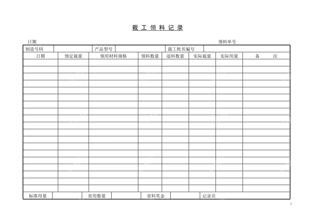 这是一份专业规范的裁工领料记录单模板,专为服装、家居纺织品等需要裁料工序的生产企业打造,能够帮助生产管理团队高效完成裁工领料全流程的记录与管控,是生产领料管理环节不可或缺的实用工具。这份裁工领料记录单模板的结构清晰规整,完全贴合裁断车间的实际工作流程设计:页面顶部居中位置明确标注标题“裁工领料记录”,让使用者一眼就能识别表单用途;左上角预留日期填写区域,右上角设置专属的领料单号填写位,紧接着在标题下方依次设置了制造号码、产品型号、裁工姓名与员工编号的填写栏,从订单、产品到操作人员的基础信息都可以完整记录,方便后续溯源核对。模板的主体部分设置了逻辑清晰的统计表格,涵盖日期、预定裁量、领用材料规格、领料数量、退料数量、实际裁量、实际用量、备注等多个核心记录列,不管是整幅面料的领用,还是裁切后剩余余料的退回,都能做到逐笔登记、数据清晰,从源头避免了材料领用混乱、余料丢失错记等生产常见问题。在表格的底部,还专门设置了标准用量、省用数量、省料奖金、记录员的专属统计填写栏,不仅可以自动完成材料用量的对比统计,还能直接对接裁工省料奖金的核算工作,省去了后续二次统计核算的麻烦,帮助企业更好地推行节约用料的激励政策,降低生产原材料损耗。这份裁工领料记录单模板覆盖了裁工领料从基础信息登记、领用退料数据记录到用量统计、奖金核算的全流程需求,不管是小型加工厂还是规模化生产企业,都可以直接打印使用或者根据自身生产需求调整内容,能够有效规范生产领料流程,提升裁断车间的物料管理效率,帮助企业管控原材料成本,是生产物料管理场景中实用的标准化工具。