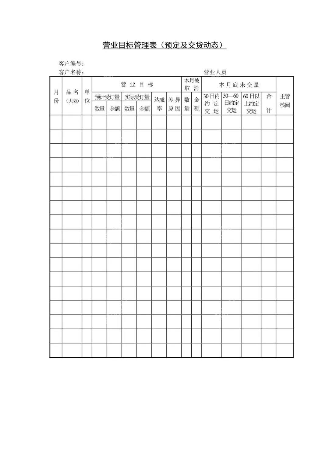 对于销售型企业的营业团队而言,精准跟踪客户营业目标、掌握订单全链路动态,是完成业绩指标、提升业务管理效率的核心抓手。这款专业的营业目标跟踪管理表格,就是专为解决营业人员订单管理混乱、目标进度不清晰问题打造的高效工具,能够帮助营业人员轻松梳理全月业务动态,精准把控业绩完成进度。这份正式命名为《营业目标管理表(预定及交货动态)》的客户营业目标跟踪管理表格,设计逻辑贴合营业人员日常工作流程,细节规划全面周到。表格顶部专门预留了客户编号、客户名称和对应负责营业人员的填写位置,方便多客户多项目管理时快速索引分类,避免不同客户订单混淆,提升日常检索效率。表格主体按照月份、品名大类、单位三个核心维度搭建统计框架,覆盖营业目标管理、本月取消订单统计、本月底未交量分类统计和主管核阅四大核心板块,维度清晰逻辑分明。其中核心的营业目标板块,进一步细分了预计受订量、实际受订量的数量与金额统计栏,还自带达成率计算和差异原因填写区域,营业人员可以一目了然看到目标与实际的差距,及时分析业绩波动原因,调整业务跟进策略。针对常见的未交货订单管理痛点,表格专门按照30日内、30-60日、60日以上三个交运周期分类统计未交量,还设置了自动合计栏,帮助营业人员快速梳理逾期未交订单,及时跟进交货进度,降低客户投诉风险。无论是月度业绩复盘,还是日常业务动态跟踪,这款客户营业目标跟踪管理表格都能帮助营业人员高效整合业务数据,清晰掌握订单全链路状态,大幅提升业务管理效率,助力企业稳步达成整体营业目标。
