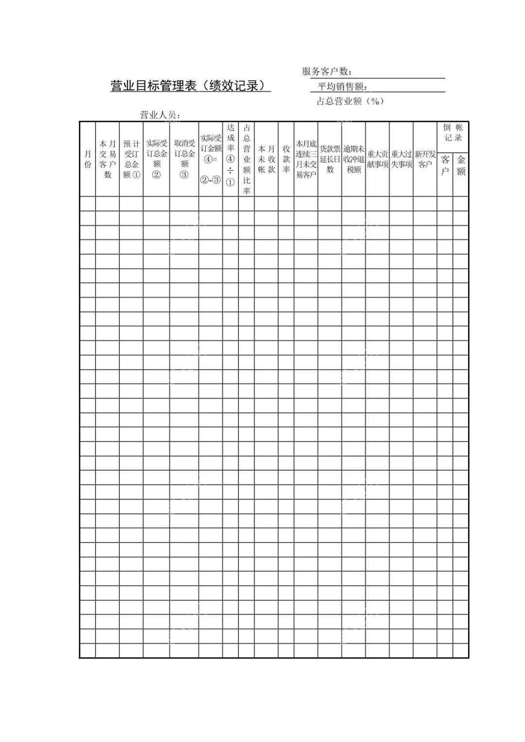 这是一份专业实用的营业目标管理表,专门为企业营业人员绩效记录打造,能够满足不同销售型企业对营业绩效精细化管理的需求,帮助销售管理团队高效完成营业绩效追踪与管理工作。这份标准化的营业目标管理表采用清晰的黑白表格样式,结构逻辑清晰,填写便捷,不管是线下打印存档,还是线上电子填写管理都能适配,是企业销售部门进行绩效管控的得力工具。这份营业目标管理表在设计上充分考虑了企业销售管理的实际需求,表格顶部专门预留了基础信息填写区域,支持填写营业人员姓名、累计服务客户数、个人平均销售额,以及个人业绩占总营业额的占比,管理团队可以一眼掌握对应营业人员的整体业绩定位,快速完成人员层级划分与绩效分层管理。表格主体部分设置了多维度的营业绩效统计项,完全覆盖营业人员月度绩效追踪的核心需求,从基础的月份维度划分,到本月交易客户数统计,再拆分设置了预计受订总金额与实际受订总金额两项,方便管理者对比目标完成情况,直观呈现营业人员的业绩达成率。除此之外,表格还专门设置了营业管理必不可少的核心追踪项,包括收款率统计、新开发客户数量记录以及倒账记录模块,帮助企业全方位掌握营业人员的工作成果与风险情况,无论是复盘月度业绩、核算绩效奖金,还是规划下阶段营业目标,这份营业目标管理表都能提供完整准确的数据支撑,有效提升企业营业绩效管理的效率,降低绩效统计的沟通成本与出错概率。