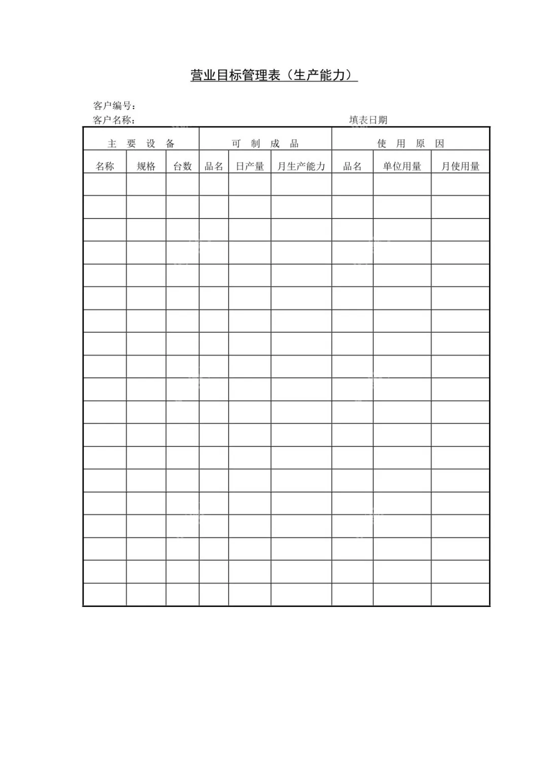这是一款专为生产制造型企业打造的生产能力类营业目标管理表,能够帮助生产端管理人员清晰梳理生产规划,精准完成营业目标拆解,是生产型企业生产管控中不可或缺的实用管理工具。这款生产能力类营业目标管理表,从设计之初就贴合生产企业的实际管理需求,整体结构清晰,预留了完整的填写空间,方便企业根据自身生产情况补充信息。管理表顶部明确标注了核心标题“营业目标管理表(生产能力)”,同时预留了客户编号、客户名称和填表日期的标准填写位置,不管是面向固定客户的定向生产规划,还是企业内部周期性的生产目标梳理,都可以快速完成信息归类,方便后续存档和查阅。整张表格分为三大核心功能板块,分别对应生产端管理的不同维度:第一板块为主要设备信息栏,专门设置了名称、规格、台数三个填写项,方便企业统计现有生产设备的配置情况,清晰掌握生产硬件基础;第二板块为可制成品产能统计栏,设置了品名、日产量、月生产能力三个维度,可以直观呈现不同成品的生产能力,帮助管理者快速测算整体产能规模;第三板块为原料使用数据统计栏,设置了品名、单位用量、月使用量三个填写项,方便企业精准核算原料需求,提前做好原料采购和库存规划。整张管理表预留了大量空白填写行,完全可以满足不同规模生产企业的信息录入需求,不管是小型加工厂还是中大型制造企业,都可以借助这款生产能力类营业目标管理表,系统梳理生产端的设备、产能、原料信息,精准匹配营业目标的生产需求,有效避免产能错配、原料库存积压或缺货等问题,助力企业高效完成生产端营业目标规划,提升生产管理效率,优化整体营业收益。对于生产计划专员、生产部门管理者来说,这款标准化的生产能力营业目标管理表,能大幅降低手动整理数据的工作量,让生产目标梳理工作更规范、更高效。
