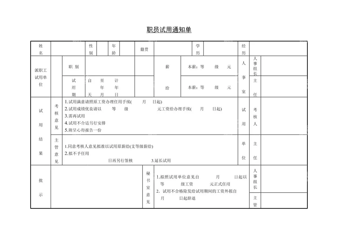 对于企业人事管理来说,规范新员工入职试用以及员工察看流程,是降低用工风险、优化人员管理的核心环节,一套标准化的表单模板能大幅提升人事工作的效率,我们提供的职员试用通知单与试用察看通知单模板,就是为满足企业人事管理需求打造的专业工具,覆盖人事管理全流程核心内容,适配各类大中小微企业的人事管理场景。其中核心的职员试用通知单模板,沿用标准的纸质表单样式,完全适配打印填写与电子化录入双重使用场景,表格结构清晰分层,满足不同企业的管理习惯。模板顶部明确标注“职员试用通知单”标题,一目了然;上半部分设置专属的职员基础信息登记栏,涵盖姓名、性别、年龄、籍贯、学历、工作经历等完整的个人信息项目,帮企业人事完整留存新员工核心资料,同时专门设置派职工试用单位相关填写区域,包含职别、试用薪资、试用期限等关键信息模块,明确试用期间的岗位与待遇标准,避免劳资纠纷。模板下半部分专门设置考核意见、主管意见、人事批示板块,明确区分试用合格、试用不合格、延长试用期等不同结果的处理流程,还预留了人事相关负责人的签署栏,权责划分清晰,帮助企业规范完整留存试用考核全流程记录。除职员试用通知单外,整套模板还包含试用察看通知单,涵盖试用信息登记、考核审批、察看流程等全流程人事管理内容,不管是新员工入职试用管理,还是在职员工违纪察看管理,都能满足需求,帮助企业人事部门快速规范试用及察看流程,降低人事管理的沟通成本与合规风险,提升人事管理的标准化水平。