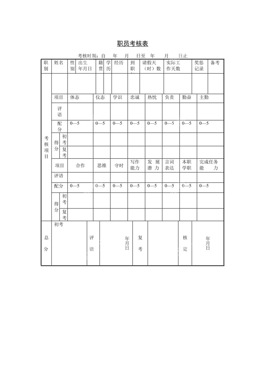 # 通用职员考核表模板,标准化企业人才考核高效工具这张通用职员考核表模板是专为企业规范化职员周期考核打造的标准化工具,整体采用清晰工整的表格版式设计,逻辑层级分明,填写门槛低,无论是人力资源新人还是资深HR都能快速上手使用,满足各类企业不同部门的员工考核需求。从版式结构来看,表格顶部清晰标注核心标题“职员考核表”,预留了专门的考核时期填写栏,可以方便填写月度、季度、半年度或者年度等不同考核周期的信息,适配企业各类定期考核场景。表格第一板块为职员基本信息栏,涵盖职别、姓名、性别、出生日期等核心个人信息项,能完整整理被考核职员的基础身份资料,方便HR归类存档与检索。接下来设置两大核心考核维度,覆盖了职员工作表现的方方面面:第一维度为个人素养类考核,包含体态、仪态等日常职业素养考核项;第二维度为工作能力类考核,包含合作、守时等岗位通用工作能力项目,每一项考核都设置了清晰的0-5分配分标准,同时单独预留了初考得分栏、复考得分栏和专属评语栏,方便考核人员分层打分、记录评价,让考核过程更公开透明,结果更客观精准。表格底部专门设置了总分统计栏、综合评语栏,以及初考人、复考人、核定人的签字和日期填写栏,完整覆盖了考核全流程的签字确认需求,符合企业人事管理的归档规范。这款通用职员考核表模板,多维度的考核设计适配绝大多数岗位的职员周期考核需求,能帮助企业高效完成员工能力评估,为人才晋升、调岗、培训提供可靠的数据支撑,是企业人力资源管理中非常实用的标准化考核工具。