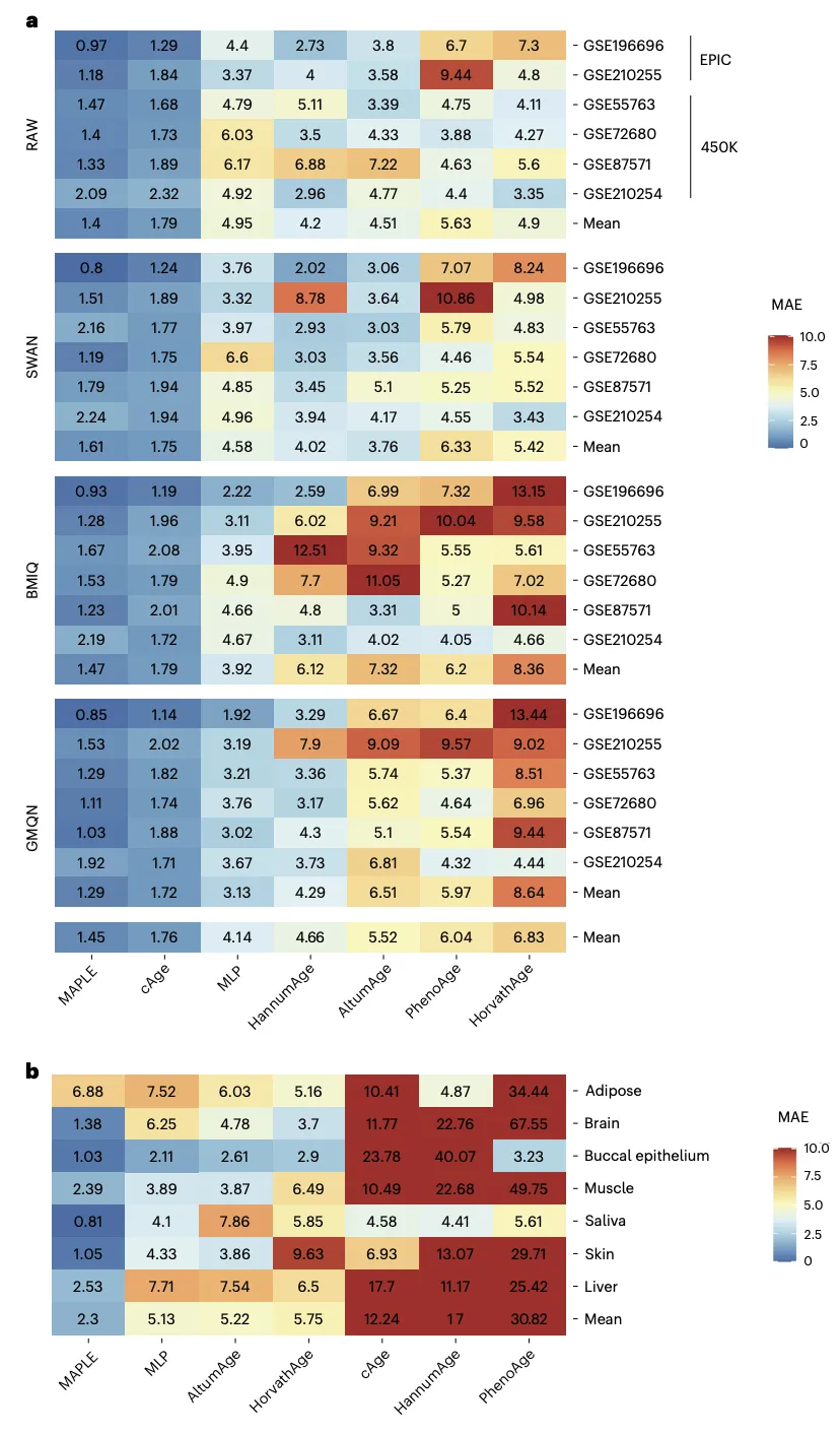 结果显示,在跨平台血液样本分析中,MAPLE 的平均绝对误差仅为 1.45 年,相关系数高达 0.97;相比之下,传统多层感知器(MLP)模型的误差达到 4.14 年,相关系数仅为 0.88。在大脑、肌肉、皮肤等非血液组织中,MAPLE 同样保持稳定优势,平均误差为 2.30 年,显著优于其他方法。