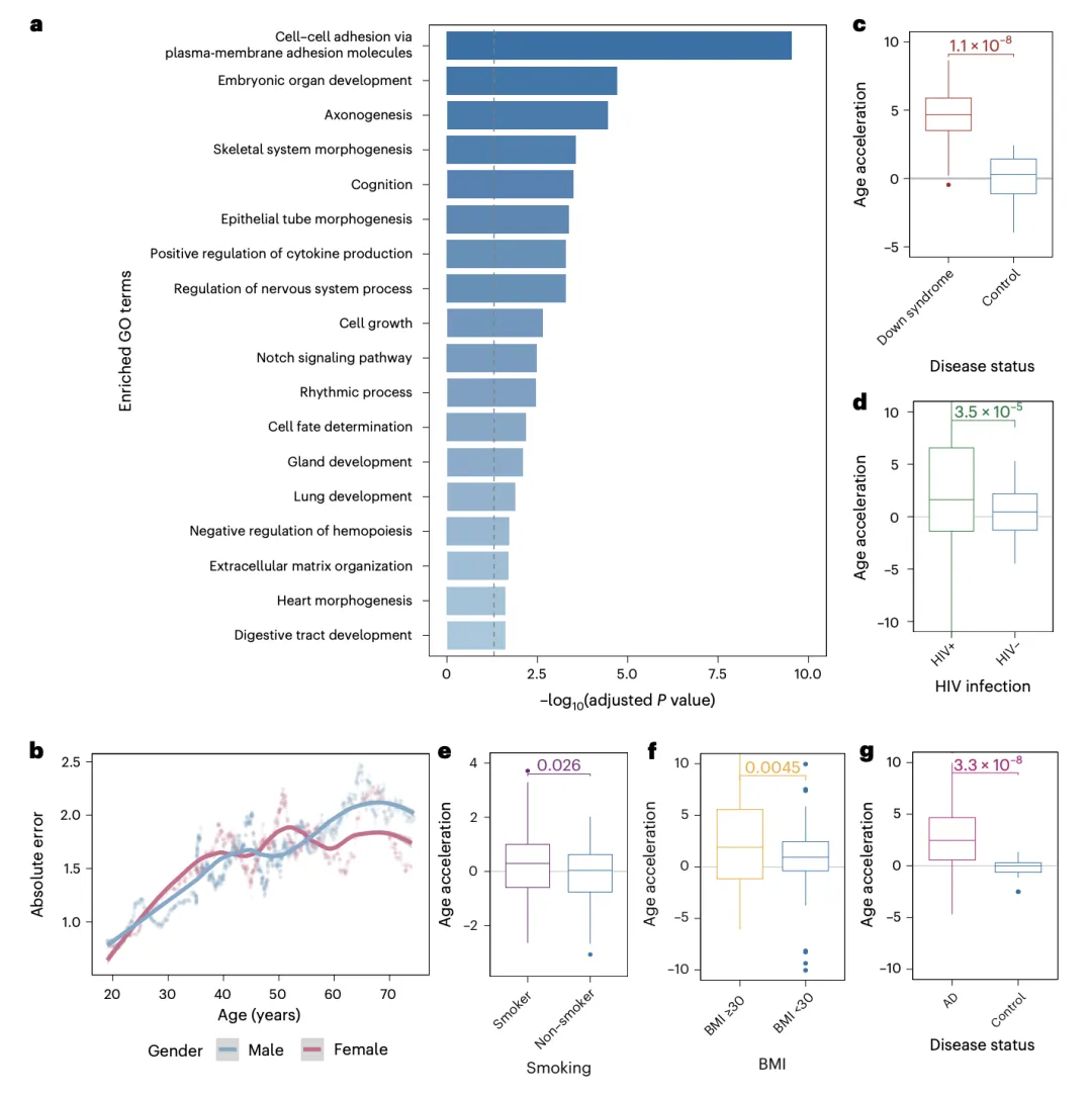 进一步分析模型关注的关键 CpG 位点后,研究人员发现,这些位点显著富集于器官发育、细胞黏附、认知功能以及免疫调节等与衰老密切相关的生物学通路,从分子层面验证了 MAPLE 预测结果的合理性。